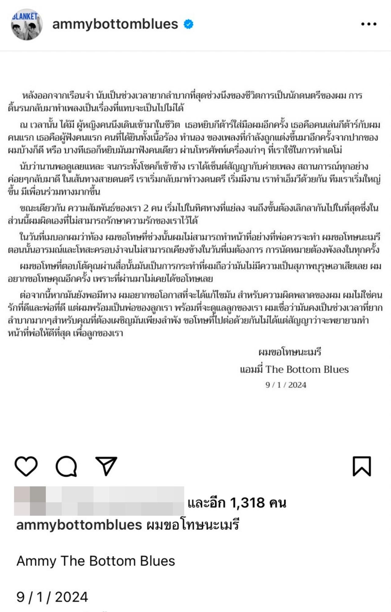 ล่าสุด แอมมี่ ก็ได้ออกมาโพสต์ข้อความขอโทษ เมรี แล้ว บอกว่า ในช่วงที่ เมรี บอกว่าท้อง ขอโทษที่ไม่สามารถทำหน้าที่พ่ออย่างที่ควรจะทำ ตอนนั้นอารมณ์และโทสะครอบงำ ถ้าเป็นไปได้อยากขอโอกาสแก้ไขมัน ถึงจะไม่ใช่คนรักที่ดี แต่ก็พร้อมเป็นพ่อของลูก พร้อมที่จะดูแลลูกของเรา