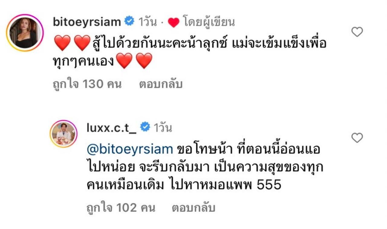 ทางด้าน ใบเตย ก็ได้เข้ามาคอมเมนต์ว่า "สู้ไปด้วยกันนะคะน้าลุกซ์ แม่จะเข้มแข็งเพื่อทุกๆ คนเอง".