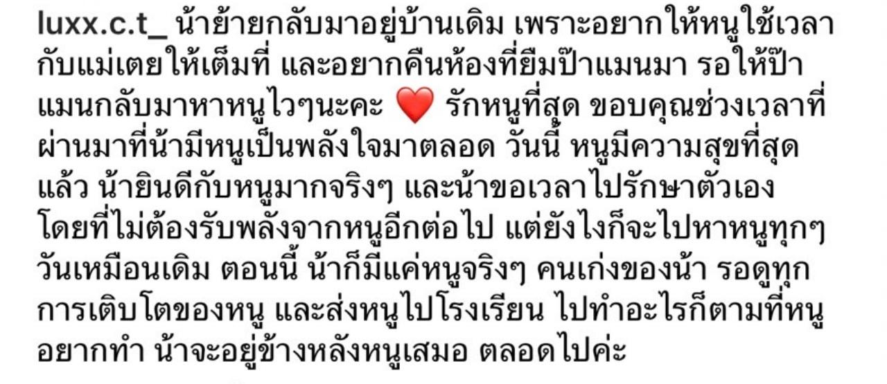 นอกจากนี้ ลุกซ์ ยังได้โพสต์ข้อความเพิ่มเติ่มว่า "น้าย้ายกลับมาอยู่บ้านเดิม เพราะอยากให้หนูใช้เวลากับแม่เตยให้เต็มที่ และอยากคืนห้องที่ยืมป๊าแมนมา รอให้ป๊าแมนกลับมาหาหนูไวๆ นะคะ รักหนูที่สุด ขอบคุณช่วงเวลาที่ผ่านมาที่น้ามีหนูเป็นพลังใจมาตลอด วันนี้ หนูมีความสุขที่สุดแล้ว น้ายินดีกับหนูมากจริงๆ