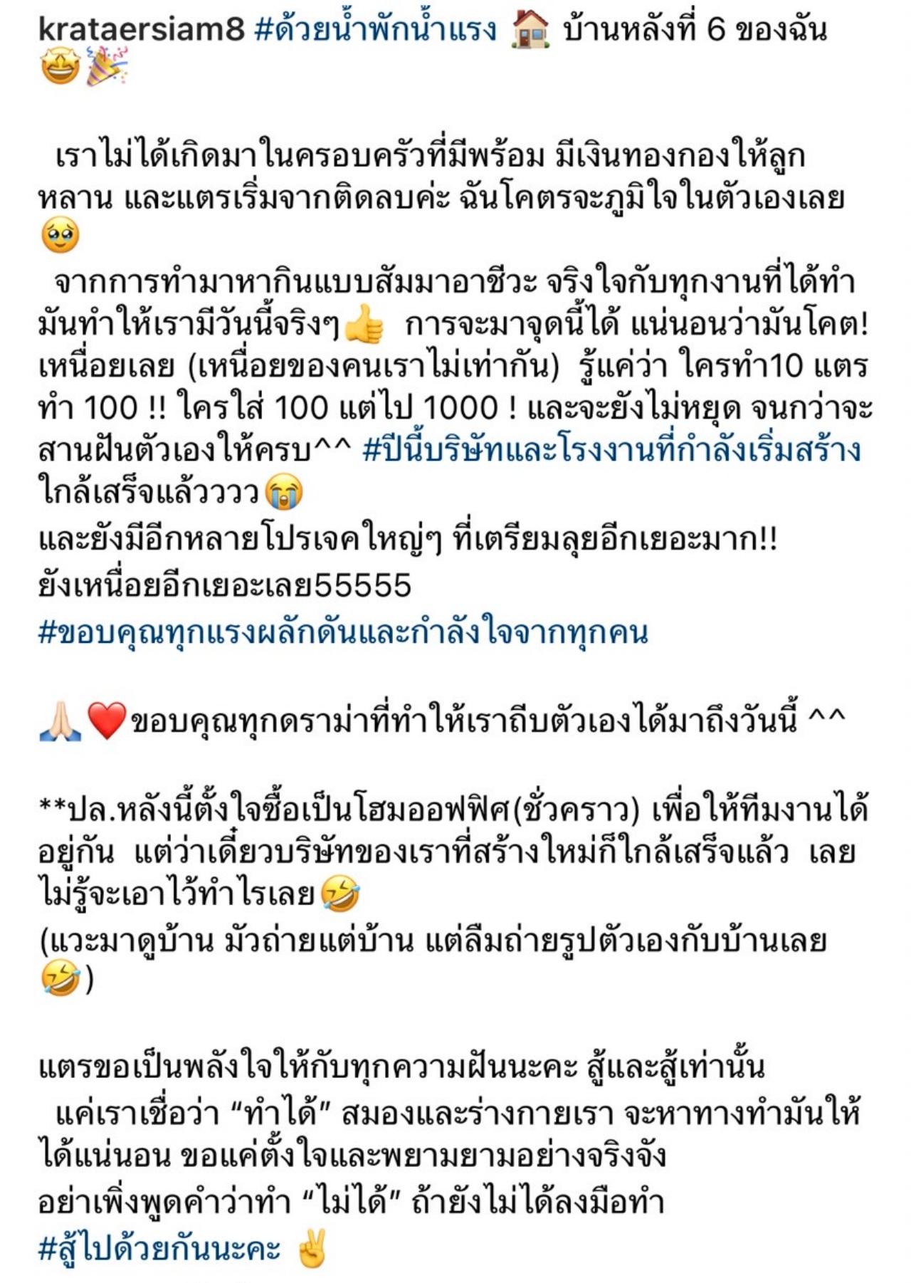 เราไม่ได้เกิดมาในครอบครัวที่มีพร้อม มีเงินทองกองให้ลูกหลาน และแตรเริ่มจากติดลบค่ะ ฉันโคตรจะภูมิใจในตัวเองเลย จากการทำมาหากินแบบสัมมาอาชีวะ จริงใจกับทุกงานที่ได้ทำ มันทำให้เรามีวันนี้จริงๆ การจะมาจุดนี้ได้ แน่นอนว่ามันโคตร!เหนื่อยเลย (เหนื่อยของคนเราไม่เท่ากัน) รู้แค่ว่า ใครทำ 10 แตรทำ 100!! ใครใส่ 100 แต่ไป 1000! และจะยังไม่หยุด จนกว่าจะสานฝันตัวเองให้ครบ^^ #ปีนี้บริษัทและโรงงานที่กำลังเริ่มสร้าง ใกล้เสร็จแล้วววว