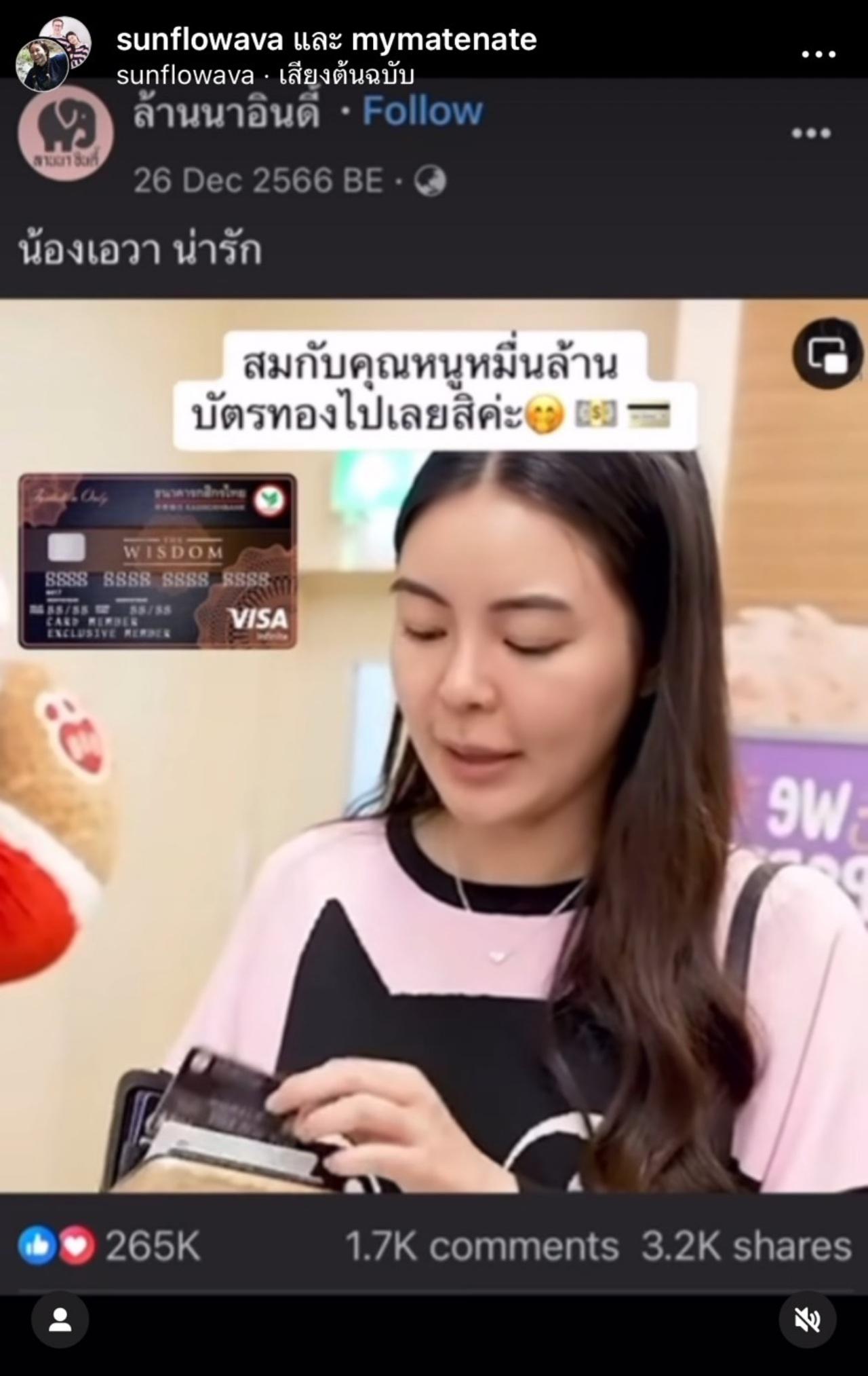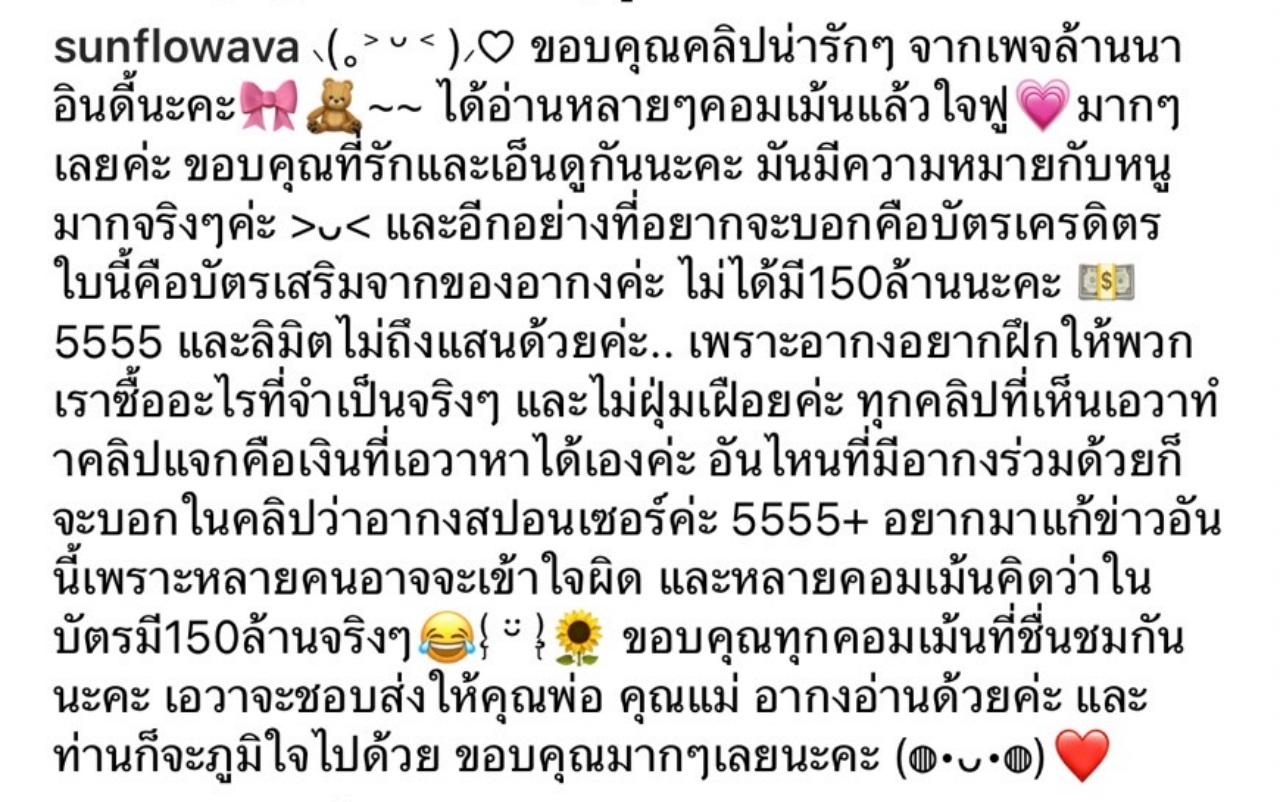 "ขอบคุณคลิปน่ารักๆ จากเพจล้านนาอินดี้นะคะ ได้อ่านหลายๆคอมเม้นแล้วใจฟูมากๆเลยค่ะ ขอบคุณที่รักและเอ็นดูกันนะคะ มันมีความหมายกับหนูมากจริงๆค่ะ และอีกอย่างที่อยากจะบอกคือบัตรเครดิตร ใบนี้คือบัตรเสริมจากของอากงค่ะ ไม่ได้มี150ล้านนะคะ 5555 และลิมิตไม่ถึงแสนด้วยค่ะ.. เพราะอากงอยากฝึกให้พวกเราซื้ออะไรที่จําเป็นจริงๆ และไม่ฝุ่มเฝือยค่ะ ทุกคลิปที่เห็นเอวาทําคลิปแจกคือเงินที่เอวาหาได้เองค่ะ อันไหนที่มีอากงร่วมด้วยก็จะบอกในคลิปว่าอากงสปอนเซอร์ค่ะ 5555+ อยากมาแก้ข่าวอันนี้เพราะหลายคนอาจจะเข้าใจผิด และหลายคอมเม้นคิดว่าในบัตรมี150ล้านจริงๆ ขอบคุณทุกคอมเม้นที่ชื่นชมกันนะคะ เอวาจะชอบส่งให้คุณพ่อ คุณแม่ อากงอ่านด้วยค่ะ และท่านก็จะภูมิใจไปด้วย ขอบคุณมากๆเลยนะคะ"