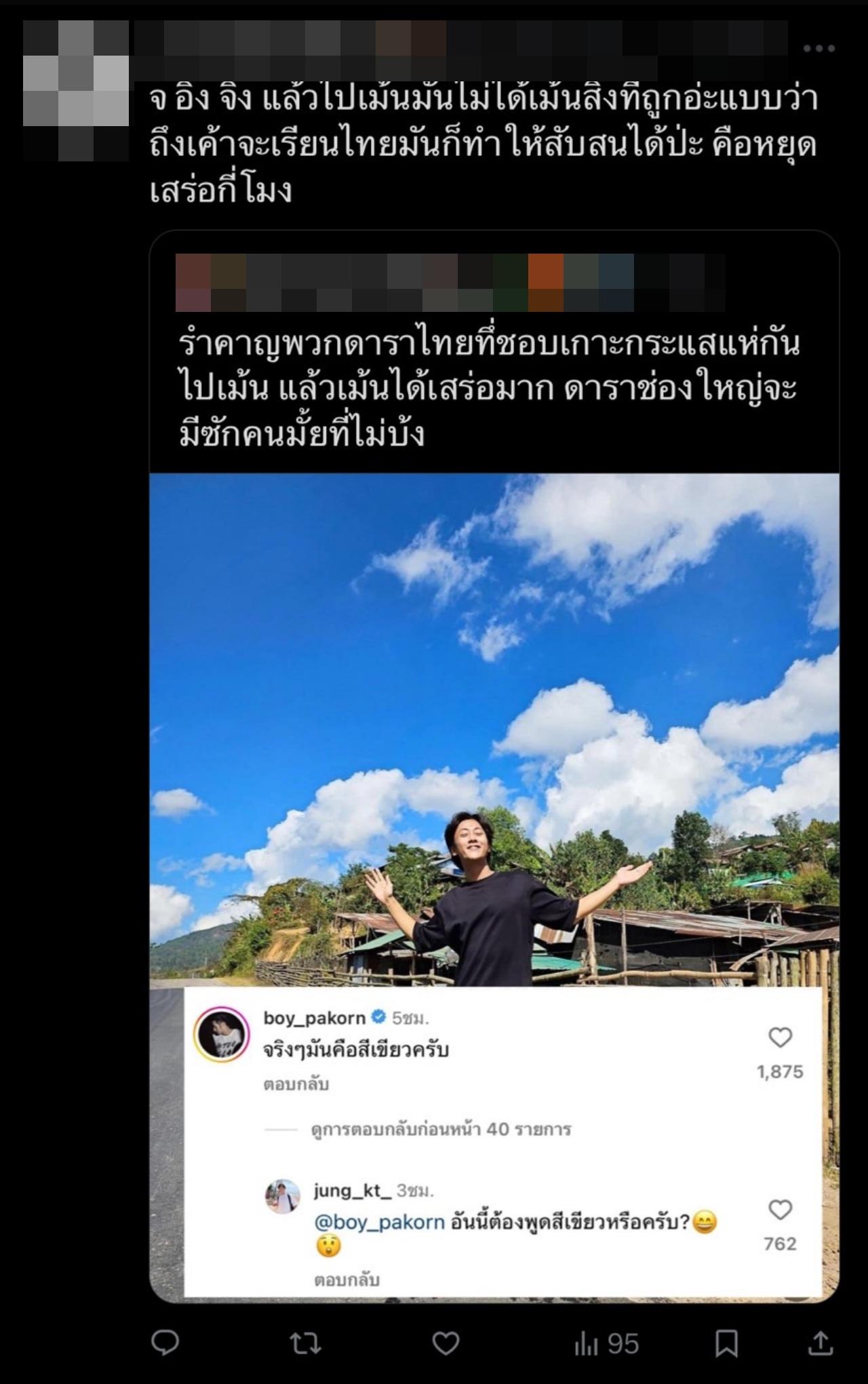 “ดาราก็ติ่งเป็นเว้ยแค่ไปเมนต์ต้องด่าเกาะกระแส? สอนคำผิดเจตนาแค่เป็นมุกแซวเล่น ก็ไม่จำเป็นต้องเดือดด่าว่าสะเหล่ออะไรขนาดนั้น บอกดีๆ ก็ได้จ้า มันไม่ได้ร้ายแรง เพื่อนแดนยังสอนคำว่าอร่อยสัxเลย ชมพู่สอนจียอนเรียกขนตาว่าหมอx ยังไม่เดือดกันขนาดนี้ กุว่าติ่งทรีตเขาปกติเถอะ อย่ายกให้สูงมาก”.