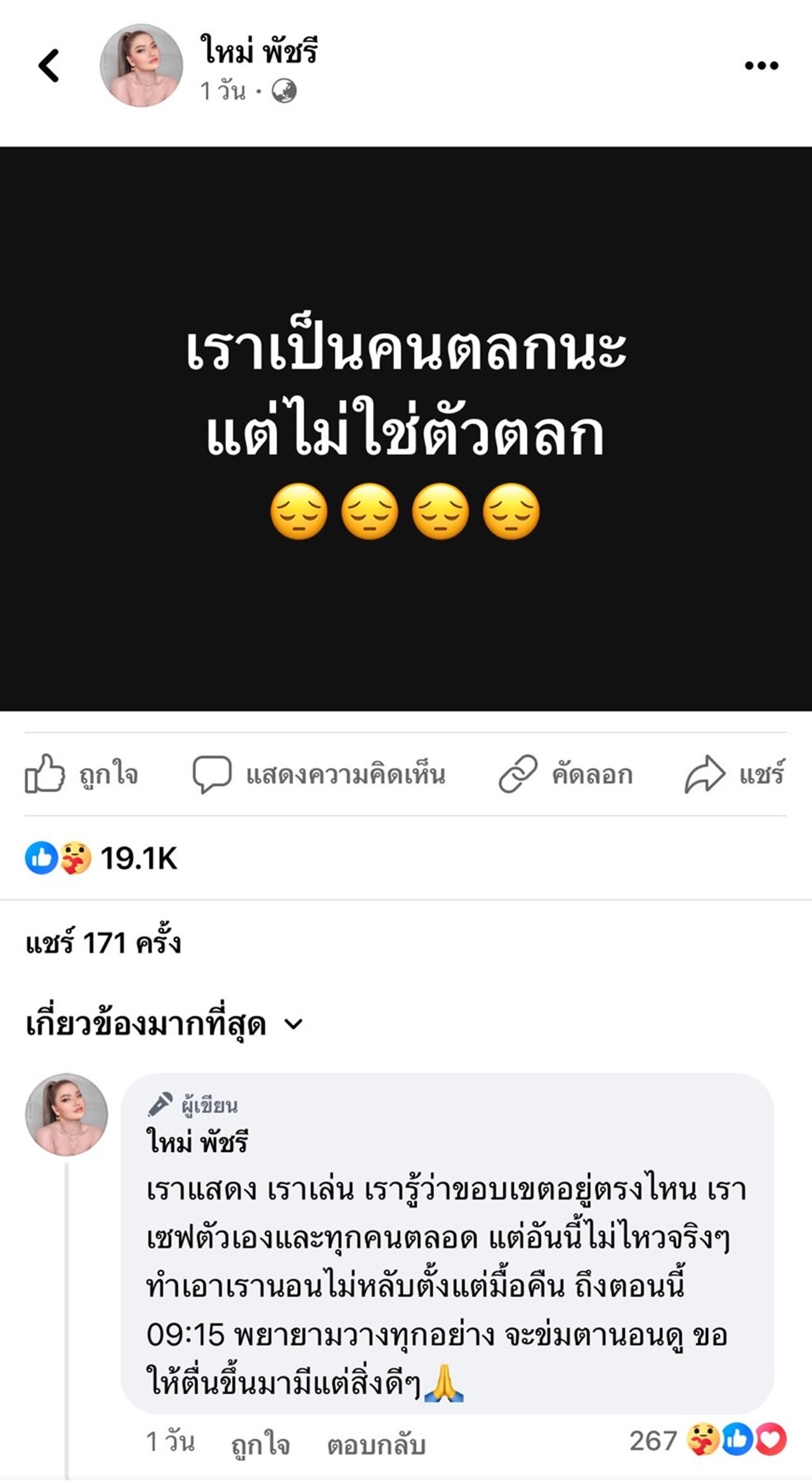 และเขียนเพิ่มอีกว่า "เราแสดง เราเล่น เรารู้ว่าขอบเขตอยู่ตรงไหน เราเซฟตัวเองและทุกคนตลอด แต่อันนี้ไม่ไหวจริงๆ ทำเอาเรานอนไม่หลับตั้งแต่มื้อคืน ถึงตอนนี้ 09.15 น. พยายามวางทุกอย่าง จะข่มตานอนดู ขอให้ตื่นขึ้นมามีแต่สิ่งดีๆ"