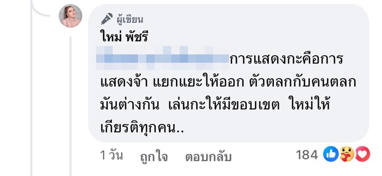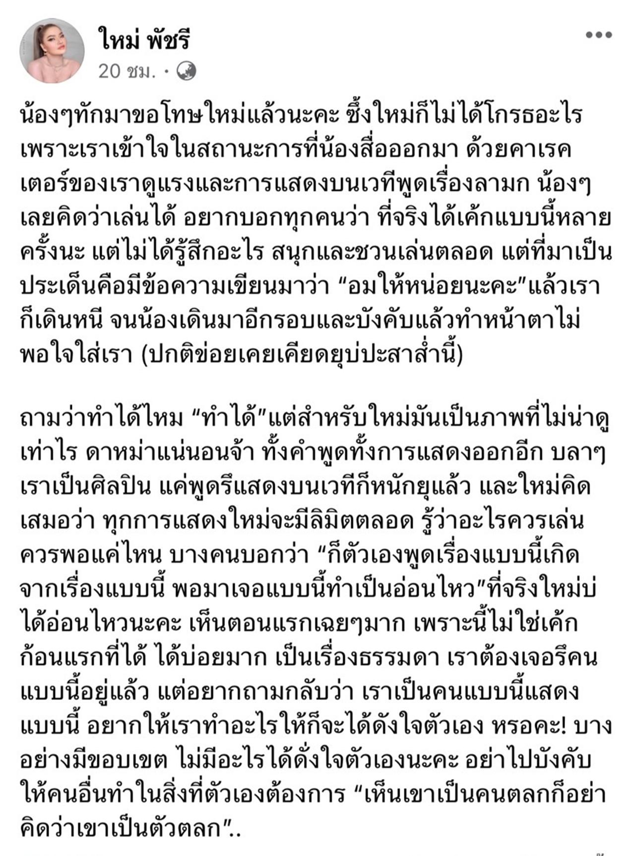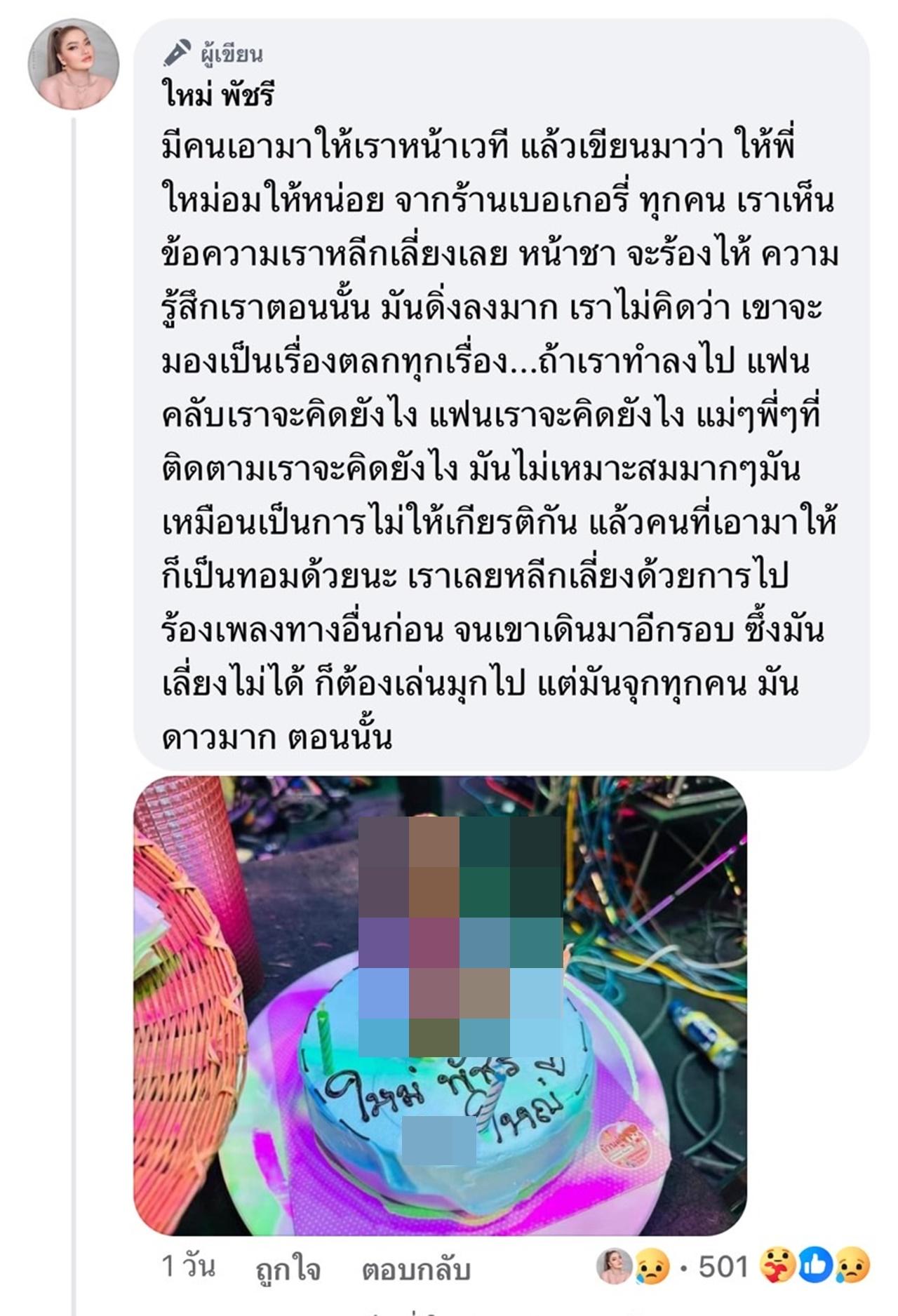 จากนั้น ใหม่ พัชรี ก็ได้อธิบายเรื่องที่เกิดขึ้นพร้อมโพสต์ภาพรูปเค้กที่เป็นรูปอวัยวะเพศ และเขียนว่า "มีคนเอามาให้เราหน้าเวที แล้วเขียนมาว่าให้พี่ใหม่ อมให้หน่อย จากร้านเบเกอรี่ ทุกคนเราเห็นข้อความเราหลีกเลี่ยงเลย หน้าชา จะร้องไห้ ความรู้สึกเราตอนนั้น มันดิ่งลงมาก เราไม่คิดว่า เขาจะมองเป็นเรื่องตลกทุกเรื่อง...