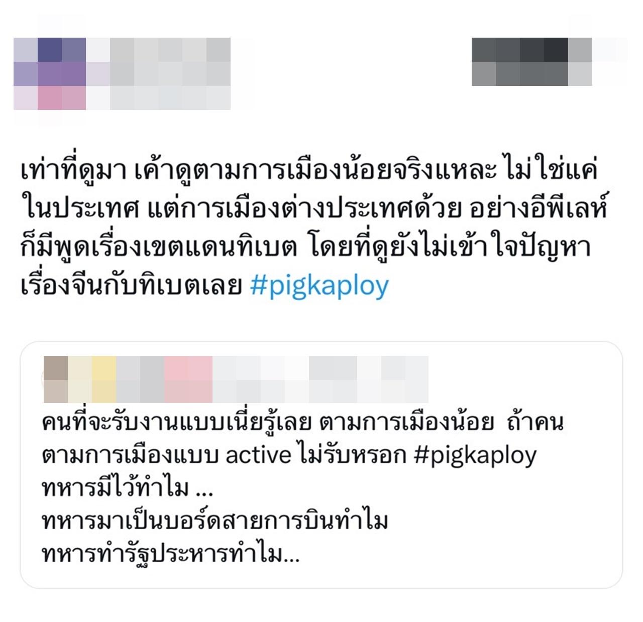 กลายเป็นดราม่าใหญ่เลยทีเดียว เมื่อนักแสดงสาว และยูทูบเบอร์สาวชื่อดัง พลอย Pigkaploy หรือ พลอย พลอยไพลิน ตั้งประภาพร ได้ออกมาทำคลิปเผยแพร่เนื้อหาของทหารชายแดน ด้วยการโปรโมตคอนเทนต์ "ทหารมีไว้ทำไม?" จนกลายเป็นกระแส และขึ้นเทรนด์ทวิตเตอร์ (x) ทันที ชาวเน็ตถกกันสนั่น โยงกันนัวทั้งเรื่องการเมือง และการตีความหมาย แตกความคิดเห็นออกเป็น 2 ฝ่าย