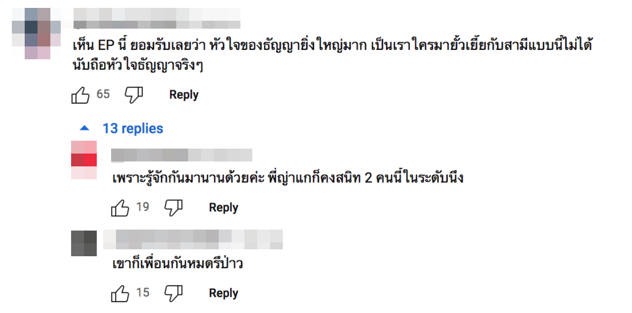 เพราะมีซีนจุ๊บปากแบบนี้ งานนี้เลยทำเอาชาวเน็ตบางคนถึงกับเข้ามาคอมเมนต์แสดงความคิดเห็นว่า “เห็น EP นี้ ยอมรับเลยว่า หัวใจของธัญญ่ายิ่งใหญ่มาก เป็นเราใครมายั้วเยี้ยกับสามีแบบนี้ไม่ได้ นับถือหัวใจธัญญ่าจริงๆ, แต่เพื่อนก็เกาะแกะไปนิสสนะ จับแขนบ้าง จับหน้าบ้าง, นัวเนียเกินเบอร์ นับถือน้ำใจคุณธัญญ่า ที่ให้หญิงนัวเนียสามีได้ขนาดนี้ค่ะ”