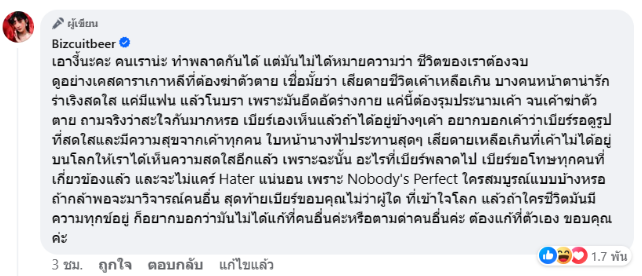 เพราะฉะนั้น อะไรที่เบียร์พลาดไป เบียร์ขอโทษทุกคนที่เกี่ยวข้องแล้ว และจะไม่แคร์ Hater แน่นอน เพราะ Nobody's Perfect ใครสมบูรณ์แบบบ้างเหรอ ถ้ากล้าพอจะมาวิจารณ์คนอื่น