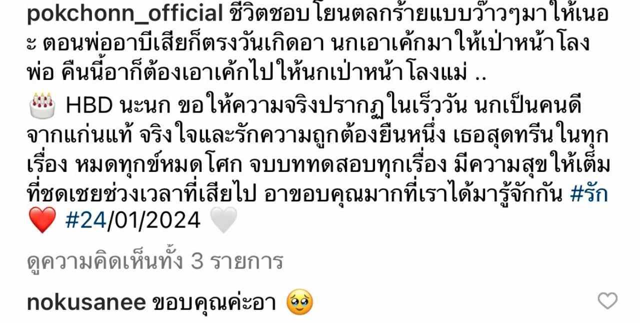 HBD นะนก ขอให้ความจริงปรากฏในเร็ววัน นกเป็นคนดีจากแก่นแท้ จริงใจและรักความถูกต้องยืนหนึ่ง เธอสุดทรีนในทุกเรื่อง หมดทุกข์หมดโศก จบบททดสอบทุกเรื่อง มีความสุขให้เต็มที่ชดเชยช่วงเวลาที่เสียไป อาขอบคุณมากที่เราได้มารู้จักกัน #รัก #24/01/2024"