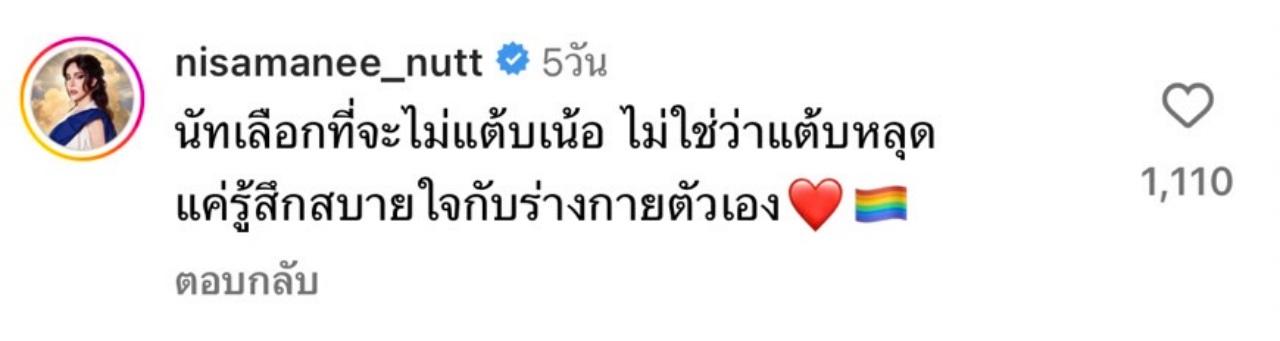 แต่งานนี้มีบางคนต่างโฟกัสผิดจุด และเข้ามาคอมเมนต์แซวว่า ใส่บิกินีสวยๆ แต่ลืมแต๊บหรือแต๊บหลุดรึเปล่า ซึ่ง นัทนิสา เองก็ได้เข้ามาตอบว่า "นัทเลือกที่จะไม่แต้บเน้อ ไม่ใช่ว่าแต้บหลุด แค่รู้สึกสบายใจกับร่างกายตัวเอง".