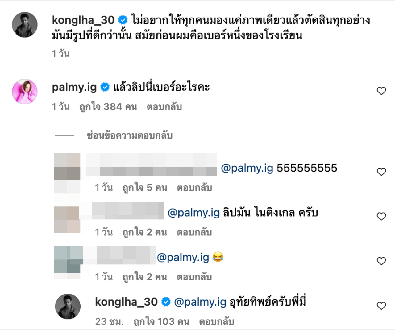นอกจากนี้ ปาล์มมี่ ก็ได้เข้ามาคอมเมนต์ในภาพความเป็นเบอร์หนึ่งของ ก้อง เพื่อถามถึงเทรนด์การแต่งหน้าว่าใช้ลิปสีอะไรว่า "แล้วลิปนี่เบอร์อะไรคะ" ทางด้าน ก้อง ก็ไม่รอช้า รีบมาคอมเมนต์ตอบนักร้องชื่อดังทันทีว่า "อุทัยทิพย์ครับพี่มี่"