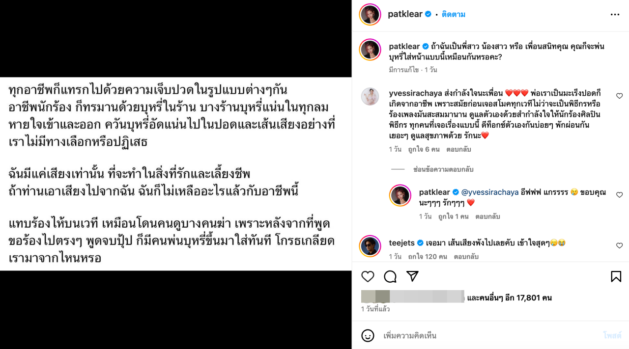 ทำเอานักร้องสาวชื่อดัง แพท วงเคลียร์ ถึงกับออกมาโพสต์ตัดพ้อกับสิ่งที่ต้องเจอมา ลงทางอินสตาแกรมส่วนตัว ระบุแคปชั่นบอกว่า