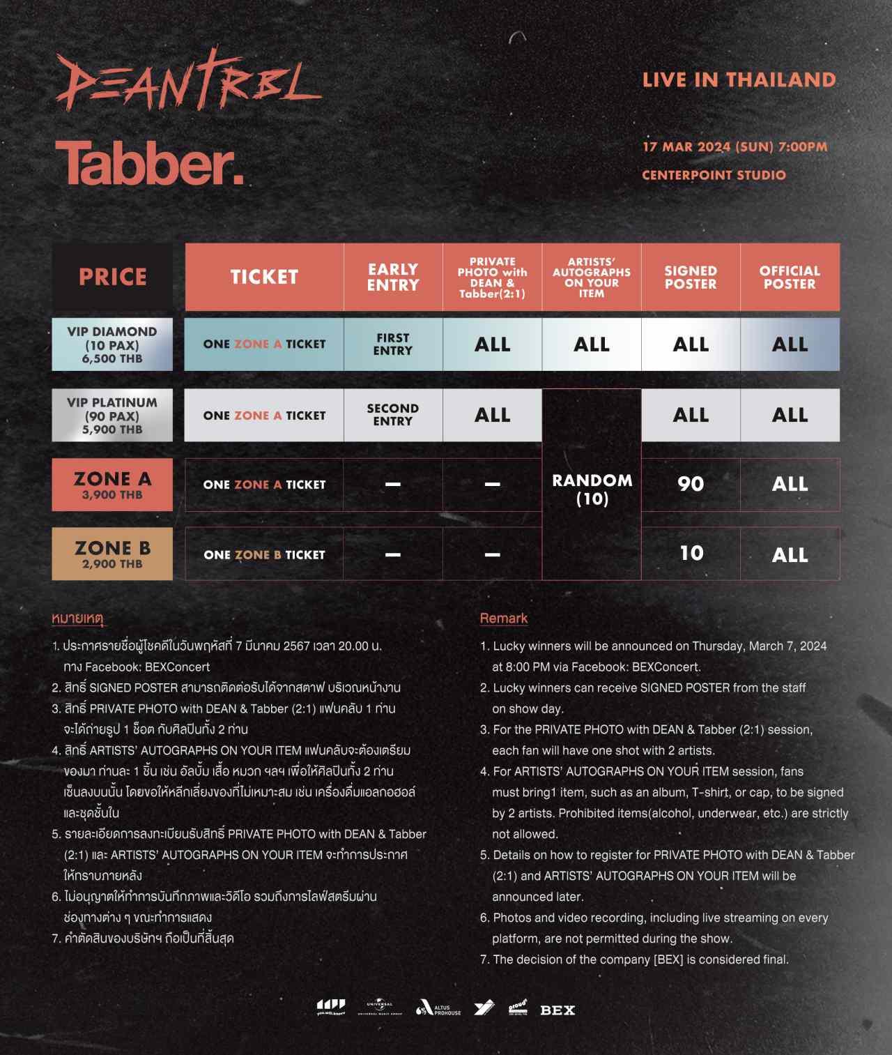 Rebels (ชื่อกลุ่มแฟนคลับ) เตรียมล็อกวันในปฏิทิน และเตรียมเจอกับหนุ่มเท่คนนี้กันได้เลย เพราะงานนี้ “DEAN with Tabber” และทีมผู้จัด ได้จัดเตรียมเซอร์ไพรส์ใหญ่ไว้ให้แฟนๆ ชาวไทยเพียบ รับประกันความใกล้ชิดแบบ Exclusive มากที่สุด! งาน “DEAN with Tabber Live in Thailand” จะถูกจัดขึ้นในวันอาทิตย์ที่ 17 มีนาคม 2567 เวลา 19:00 น. ณ CENTERPOINT STUDIO สุขุมวิท 105 (ซ.ลาซาล) บัตรราคา 6,500 / 5,900 / 3,900 และ 2,900 บาท โดยเปิดจำหน่ายในอาทิตย์ที่ 11 กุมภาพันธ์ 2567 เวลา 10:00 น. ทาง www.bexconcert.com จัดเพียง “1 รอบการแสดง” เท่านั้น ห้ามพลาด! โดยสามารถติดตามข่าวสารกิจกรรม และข้อมูลต่างๆ เพิ่มเติมได้ที่ Facebook และ X: @BEX_Concert