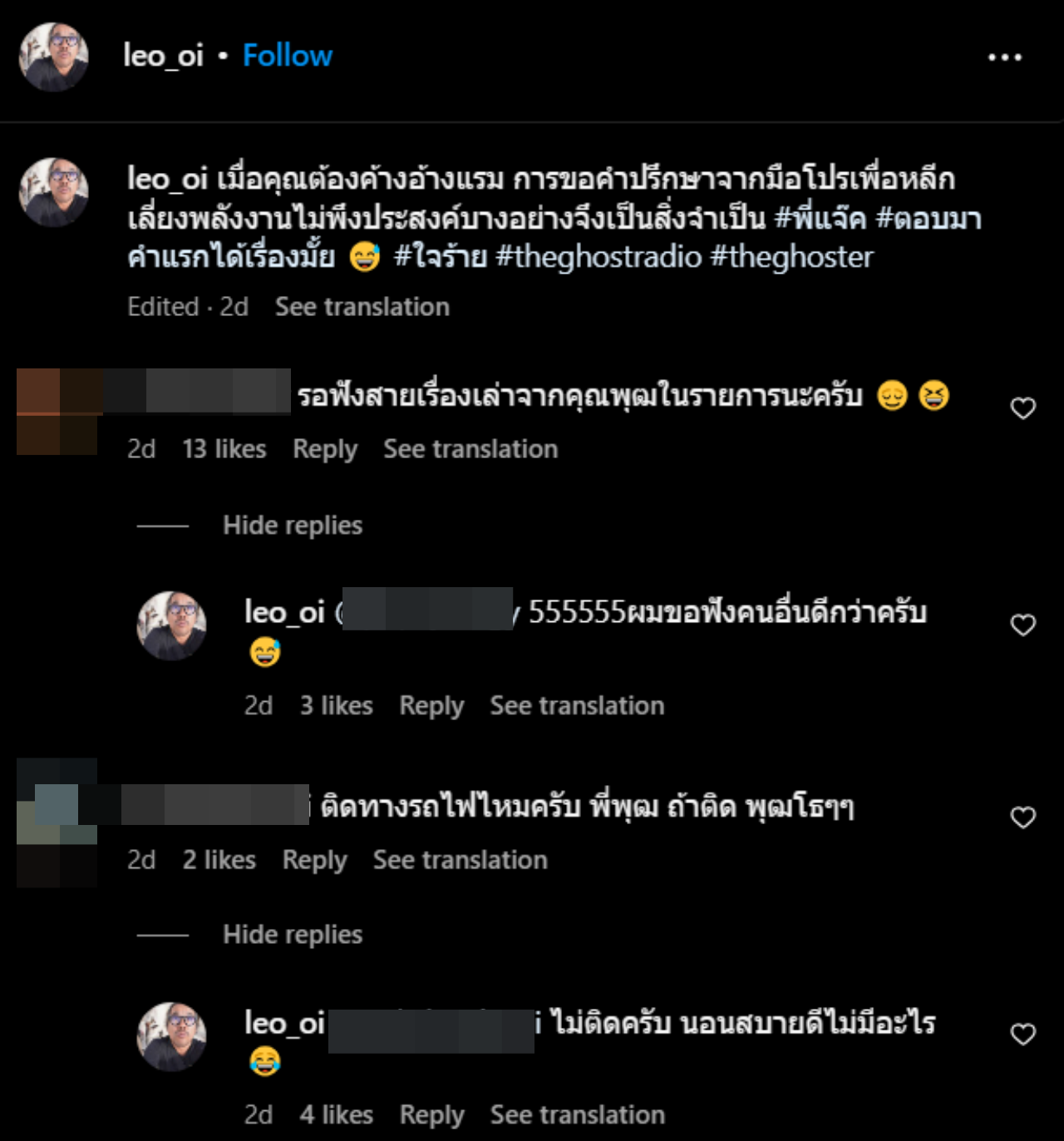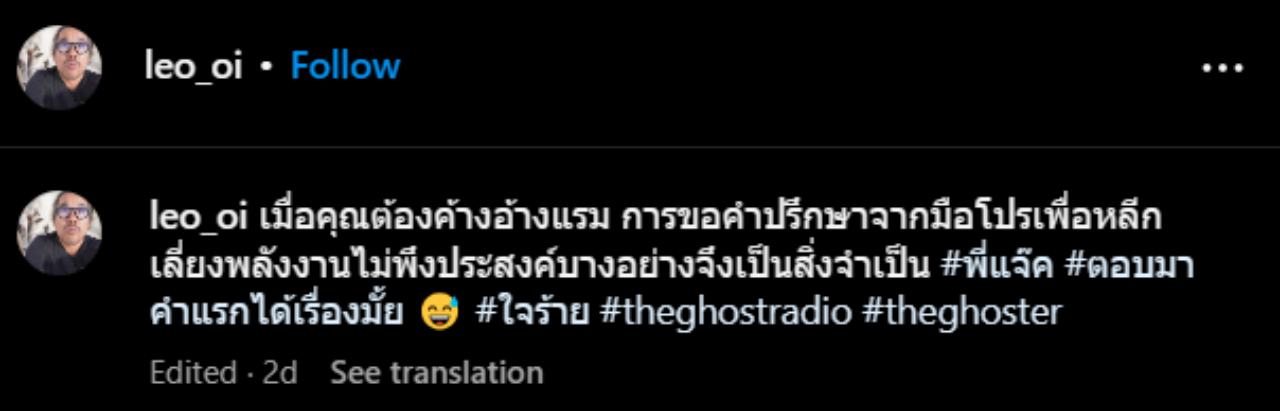 โดย ลีโอ พุฒ ได้โพสต์ภาพบทสนทนานี้ ลงบนอินสตาแกรมส่วนตัว พร้อมเขียนข้อความว่า "เมื่อคุณต้องค้างอ้างแรม การขอคำปรึกษาจากมือโปร เพื่อหลีกเลี่ยงพลังงานไม่พึงประสงค์บางอย่างจึงเป็นสิ่งจำเป็น #พี่แจ๊ค #ตอบมาคำแรกได้เรื่องมั้ย #ใจร้าย #theghostradio #theghoster"