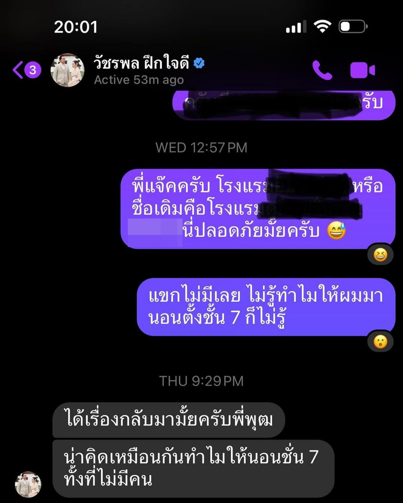 และคำตอบของ พี่แจ็ค ก็ทำให้นักร้องหนุ่มถึงกับขนหัวลุก เพราะอีกฝ่ายตอบกลับมาว่า "ได้เรื่องกลับมามั้ยครับพี่พุฒ" ก่อนจะบอกอีกว่า "น่าคิดเหมือนกันทำไมให้นอนชั้น 7 ทั้งที่ไม่มีคน"