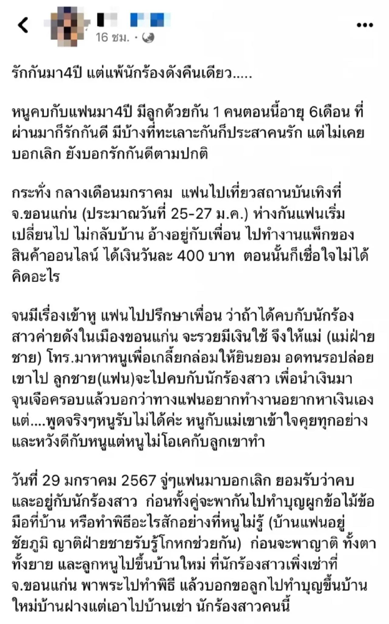 วันที่ 29 มกราคม 2567 จู่ๆ แฟนมาบอกเลิก ยอมรับว่าคบ และอยู่กับนักร้องสาว ก่อนทั้งคู่จะพากันไปทำบุญผูกข้อไม้ข้อมือที่บ้าน หรือทำพิธีอะไรสักอย่างที่หนูไม่รู้ (บ้านแฟนอยู่ชัยภูมิ ญาติฝ่ายชายรับรู้ โกหกช่วยกัน)