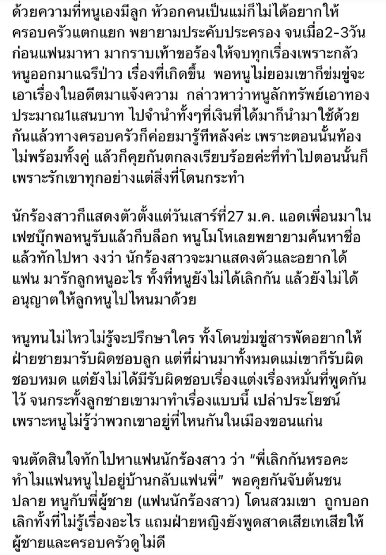นักร้องสาวก็แสดงตัวตั้งแต่วันเสาร์ที่ 27 ม.ค. แอดเพื่อนมาในเฟซบุ๊ก พอหนูรับแล้วก็บล็อก หนูโมโหเลยพยายามค้นหาชื่อ แล้วทักไปหา งงว่านักร้องสาวจะมาแสดงตัวและอยากได้แฟน มารักลูกหนูอะไร ทั้งที่หนูยังไม่ได้เลิกกัน แล้วยังไม่ได้อนุญาตให้ลูกหนูไปไหนมาไหนด้วย