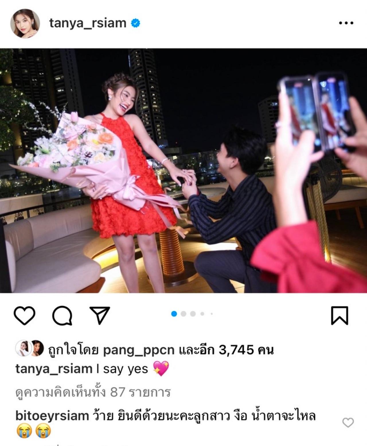 โดยฝ่ายชายได้ทำเซอร์ไพรส์สุดน่ารัก คุกเข่าสวมแหวนริมแม่น้ำเจ้าพระยา สุดโรแมนติก มีเพื่อนๆ เป็นสักขีพยานร่วมแสดงความยินดีกันอย่างอบอุ่น ส่วนข่าวดีวันวิวาห์แว่วว่า มีฤกษ์ดีภายในเดือนกุมภาพันธ์นี้แน่นอน ยังไงก็รอยืนยันจากปากของ ธัญญ่า อีกทีเร็วๆ นี้