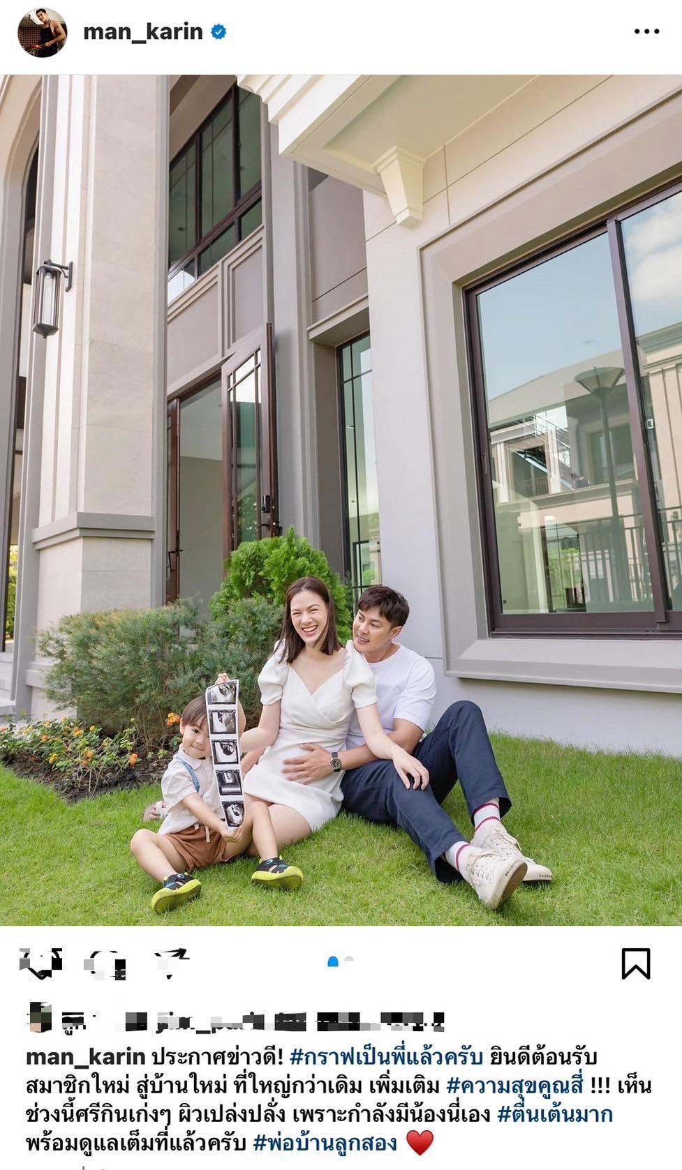 ซึ่งทั้งคู่ได้โพสต์รูปครอบครัวและถือภาพอัลตราซาวนด์ พร้อมแคปชั่นที่อ่านแล้วทำเอาใจฟู "W@man_karin ประกาศข่าวดี! #กราฟเป็นพี่แล้วครับ ยินดีต้อนรับสมาชิกใหม่ สู่บ้านใหม่ ที่ใหญ่กว่าเดิม เพิ่มเติม #ความสุขคูณสี่ !!! เห็นช่วงนี้ศรีกินเก่งๆ ผิวเปล่งปลั่ง เพราะกำลังมีน้องนี่เอง #ตื่นเต้นมาก พร้อมดูแลเต็มที่แล้วครับ #พ่อบ้านลูกสอง"