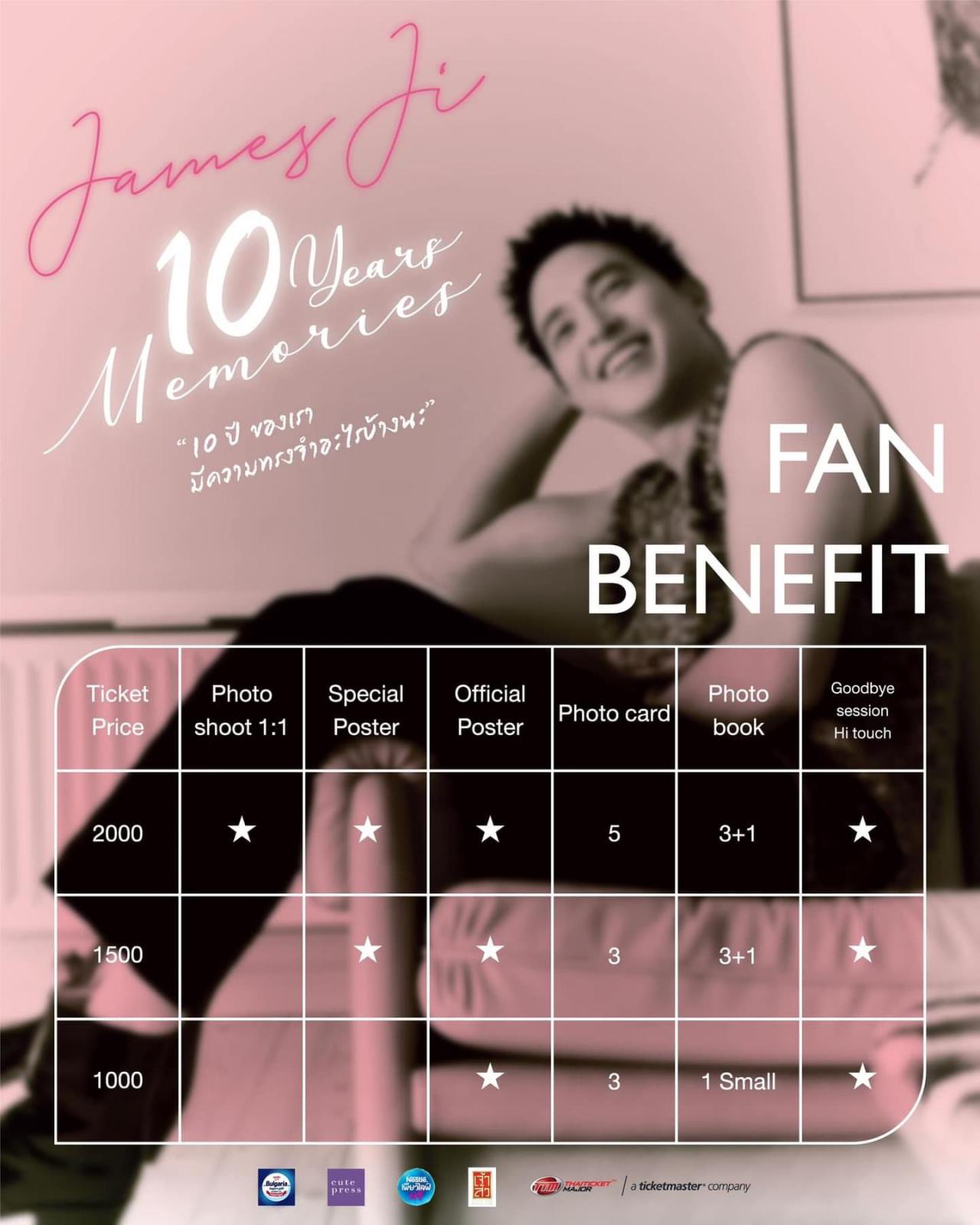 ซึ่งราคาบัตรที่แพงที่สุดอยู่ที่ราคา 2,000 บาท และบัตรราคา 1,500 บาท และ 1,000 บาท บาท พร้อมกับเผยเบเนฟิตที่แฟนๆ เห็นแล้วต้องกรีดร้อง เพราะเจมส์จิแจกให้แฟนๆ แบบหนักมาก แถมรายได้จากการขายบัตรเจ้าตัวยังประกาศว่าเตรียมจะเอาไปทำบุญ เรียกว่าแฟนๆ ได้อิ่มอกอิ่มใจไม่พอ ยังอิ่มบุญไปกับเจมส์จิอีกด้วย