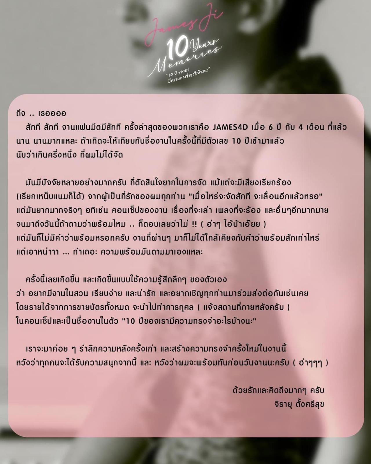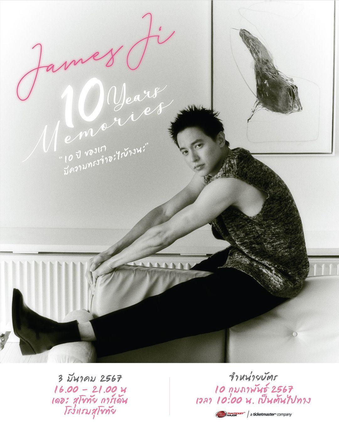 ทำเอาแฟนๆ ของพระเอกหนุ่ม เจมส์ จิรายุ ตั้งศรีสุข ถึงกับปรบมือให้แบบรัวๆ หลังจากที่หนุ่มเจมส์ได้ประกาศเตรียมจัดงานแฟนมีตติ้งให้กับแฟนๆ ของตัวเองอีกครั้งหลังจากที่ห่างหายไปนานถึง 6 ปี กับงาน "James Ji 10 Years Memories 10 ปี ของเรา มีความทรงจำอะไรบ้างนะ" เพื่อฉลองครบรอบ 10 ปี ในวงการบันเทิงของเจมส์ ที่จะจัดขึ้นในวันที่ 3 มี.ค.67 นี้ เวลา (16.00-21.00) ณ เดอะ สุโขทัย การ์เด้น โรงแรมสุโขทัย โดยเจมส์ได้ประกาศข่าวดีนี้ พร้อมกับเผยราคาบัตร และเบเนฟิตที่แฟนๆ จะได้รับแบบฉ่ำๆ และจะเปิดขายบัตรในวันที่ 10 ก.พ.นี้ ทาง Thaiticketmajor