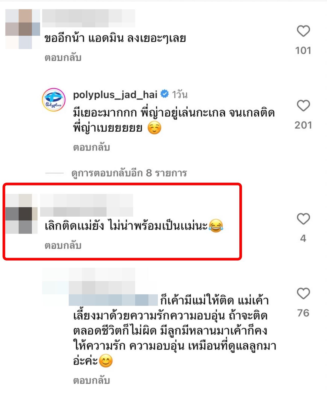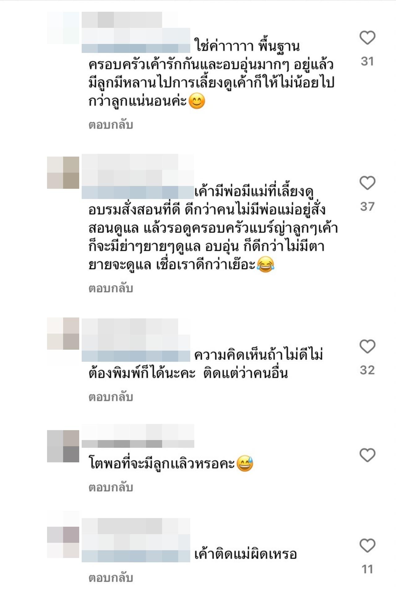 หลายคนที่ได้เห็นคลิปดังกล่าวต่างเข้ามาคอมเมนต์ชื่นชมในความน่ารักของพี่ญ่ากับน้องเกลกันยกใหญ่ แต่กลับมีชาวเน็ตคนหนึ่งได้เข้ามาคอมเมนต์ว่า "เลิกติดแม่ยัง ไม่น่าพร้อมเป็นแม่นะ" งานนี้ทำเอาคนที่เห็นคอมเมนต์ดังกล่าวได้เข้ามาโต้กลับกันจำนวนมาก.