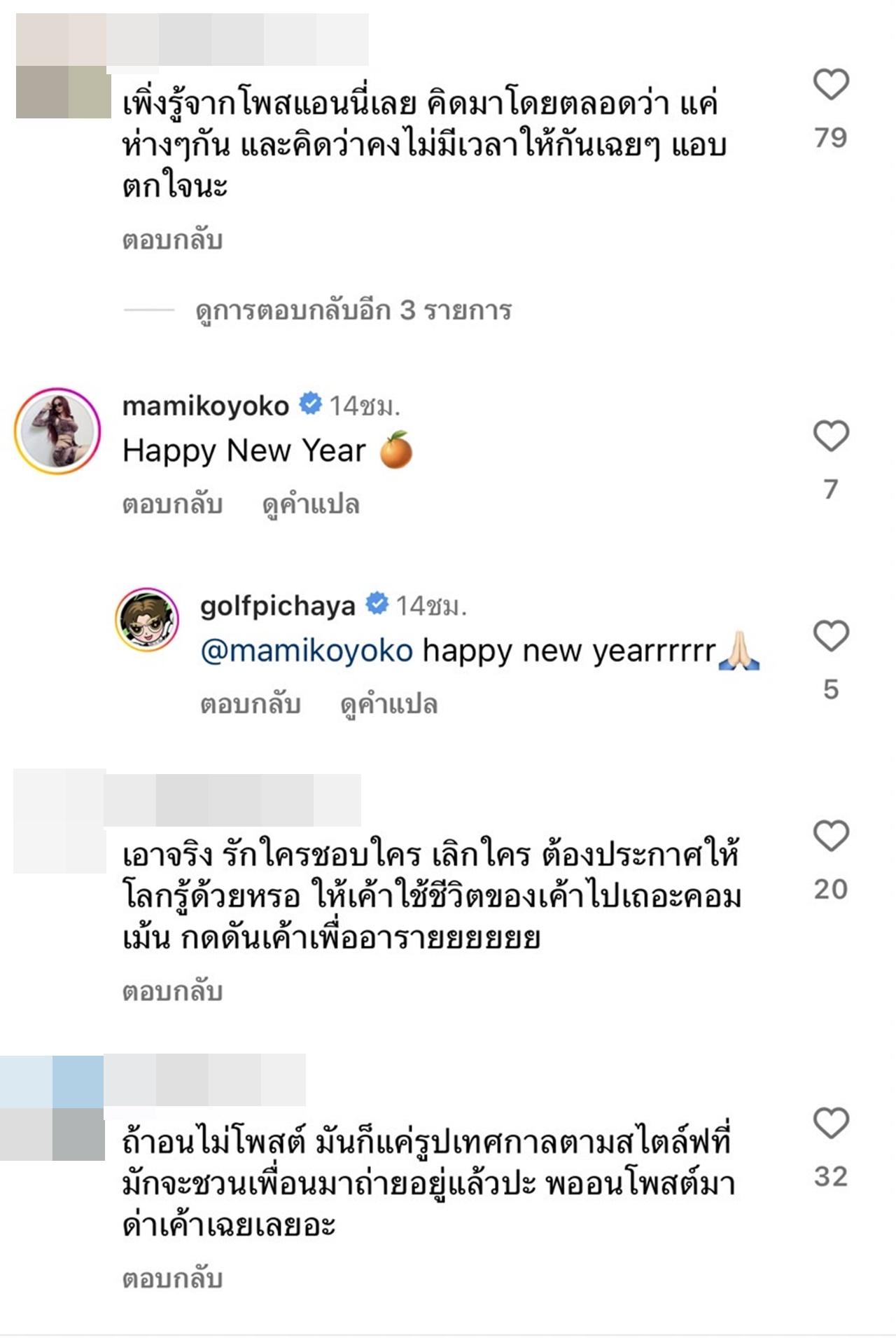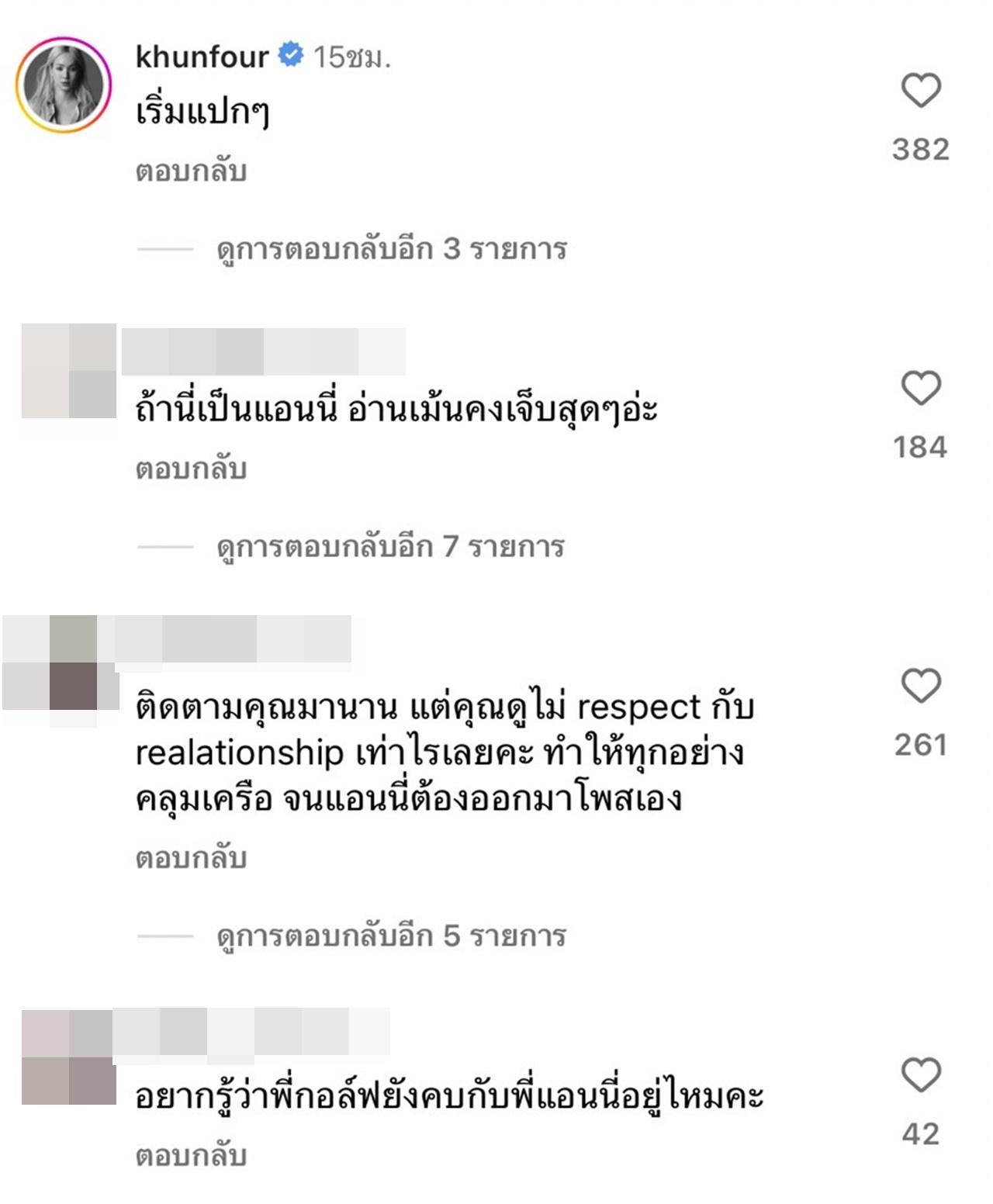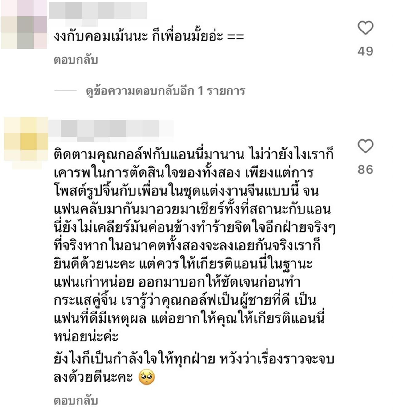 - ติดตามคุณกอล์ฟกับแอนนี่มานาน ไม่ว่ายังไงเราก็เคารพในการตัดสินใจของทั้งสอง เพียงแต่การโพสต์รูปจิ้นกับเพื่อนในชุดแต่งงานจีนแบบนี้ จนแฟนคลับมากันมาอวยมาเชียร์ทั้งที่สถานะกับแอนนี่ยังไม่เคลียร์มันค่อนข้างทำร้ายจิตใจอีกฝ่ายจริงๆ ที่จริงหากในอนาคตทั้งสองจะลงเอยกันจริงเราก็ยินดีด้วยนะคะ แต่ควรให้เกียรติแอนนี่ในฐานะแฟนเก่าหน่อย ออกมาบอกให้ชัดเจนก่อนทำกระแสคู่จิ้น เรารู้ว่าคุณกอล์ฟเป็นผู้ชายที่ดี เป็นแฟนที่ดีมีเหตุผล แต่อยากให้คุณให้เกียรติแอนนี่หน่อยน่ะค่ะ ยังไงก็เป็นกำลังใจให้ทุกฝ่าย หวังว่าเรื่องราวจะจบลงด้วยดีนะคะ