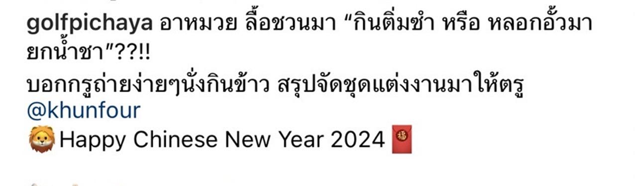 และในอินสตาแกรมของ กอล์ฟ เอง ก่อนหน้าได้ลงรูปใส่ชุดจีนกับนักร้องสาวเพื่อนสนิทอย่าง โฟร์ ศกลรัตน์ พร้อมเขียนแคปชั่นว่า "อาหมวย ลื้อชวนมา "กินติ่มซำ หรือ หลอกอั้วมายกน้ำชา"??!! บอกกรูถ่ายง่ายๆ นั่งกินข้าว สรุปจัดชุดแต่งงานมาให้ตรู @khunfour Happy Chinese New Year 2024"