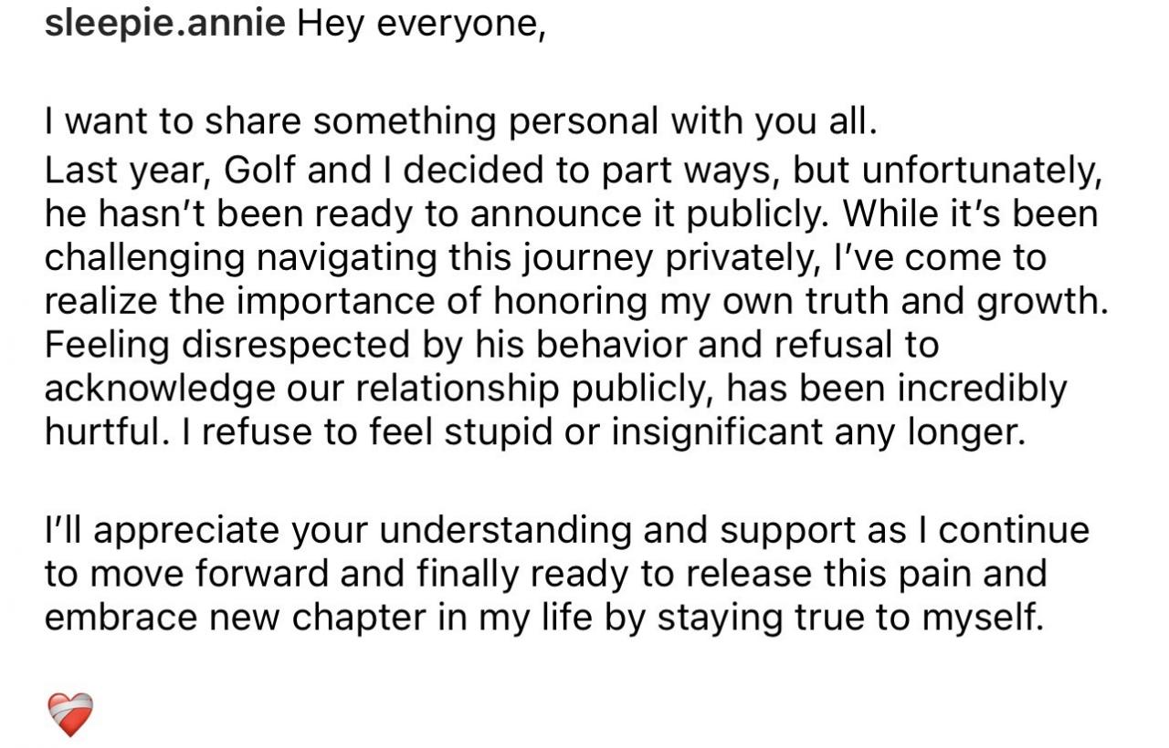 ซึ่งแปลได้ว่า "เมื่อปีที่แล้ว ฉันกับกอล์ฟตัดสินใจแยกทางกัน แต่น่าเสียดายที่เขายังไม่พร้อมที่จะประกาศต่อสาธารณะ แม้ว่าการเดินทางครั้งนี้จะเป็นเรื่องที่ท้าทาย แต่ฉันก็ได้ตระหนักถึงความสำคัญของการเคารพความจริงและการเติบโตของตัวเอง