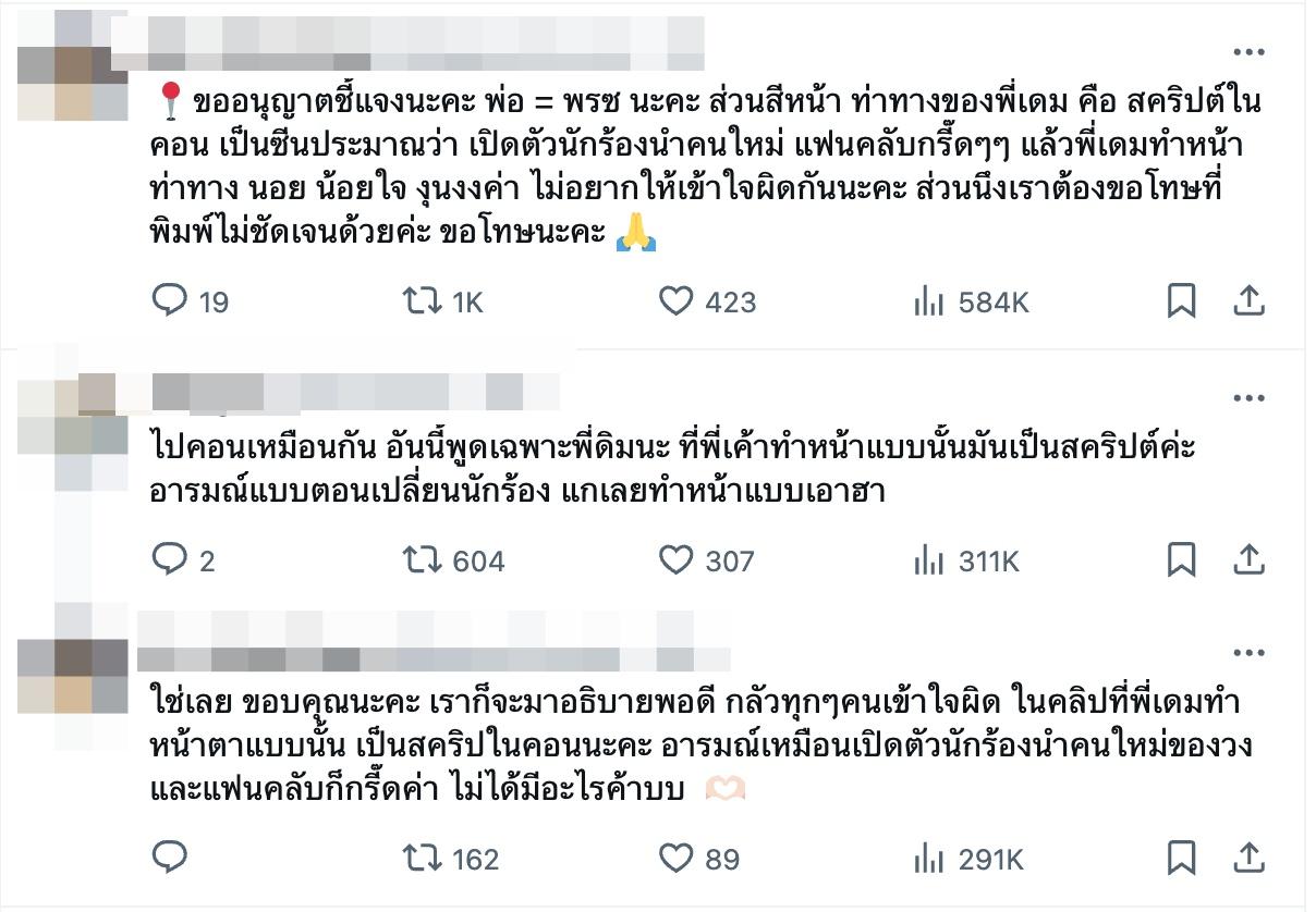 "ขออนุญาตชี้แจงนะคะ พ่อ = พรซ นะคะ ส่วนสีหน้า ท่าทางของพี่เดม คือ สคริปต์ในคอน เป็นซีนประมาณว่า เปิดตัวนักร้องนำคนใหม่ แฟนคลับกรี๊ดๆๆ แล้วพี่เดมทำหน้า ท่าทาง นอย น้อยใจ งุนงงค่า ไม่อยากให้เข้าใจผิดกันนะคะ ส่วนนึงเราต้องขอโทษที่พิมพ์ไม่ชัดเจนด้วยค่ะ ขอโทษนะคะ"