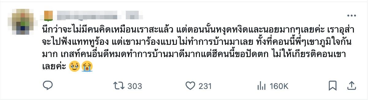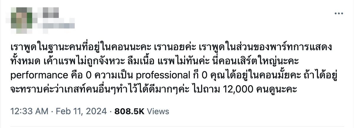 นี่คอนเสิร์ตใหญ่นะคะ performance คือ 0 ความเป็น professional ก็ 0 คุณได้อยู่ในคอนมั้ยคะ ถ้าได้อยู่จะทราบค่ะว่าเกสท์คนอื่นๆ ทำไว้ได้ดีมากๆ ค่ะ ไปถาม 12,000 คนดูนะคะ" และนอกจากนี้ก็ยังมีอีกข้อความว่า