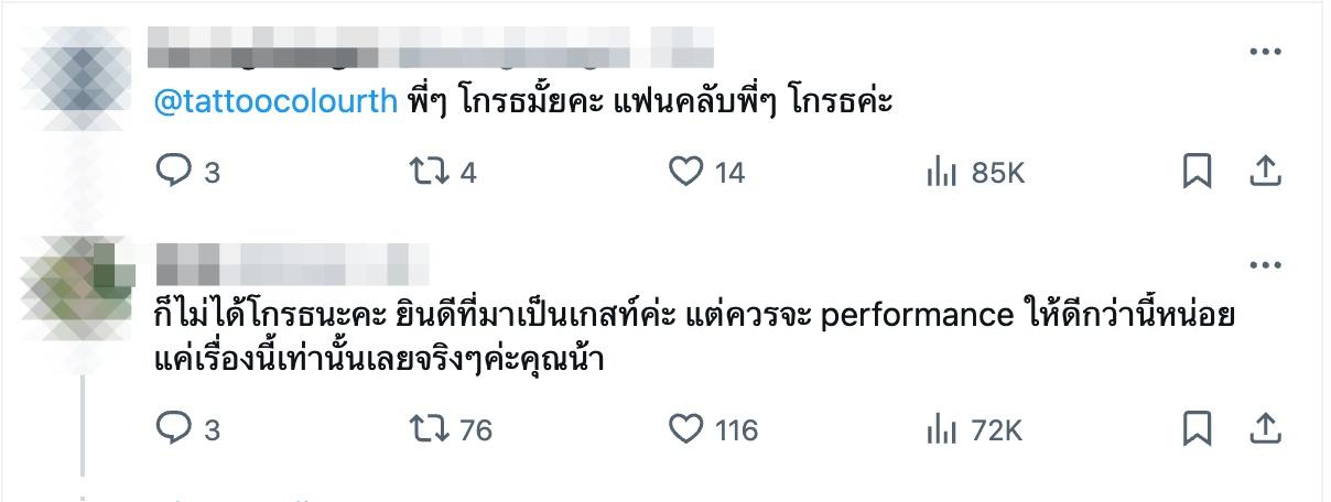 ก่อนที่จะมีชาวเน็ตคนอื่นๆ เข้ามาคอมเมนต์แสดงความคิดเห็นถึงเรื่องต่างๆ มายมาย อาทิ "นึกว่าจะไม่มีคนคิดเหมือนเราสะแล้ว แต่ตอนนั้นหงุดหงิดและนอยมากๆ เลยค่ะ เราอุส่าจะไปฟังแทททูร้อง แต่เขามาร้องแบบไม่ทำการบ้านมาเลย ทั้งที่คอนนี้พี่ๆเขาภูมิใจกันมาก เกสท์คนอื่นดีหมดทำการบ้านมาดีมากแต่ฮีคนนี้ขอปัดตก ไม่ให้เกียรติคอนเขาเลยค่ะ"
