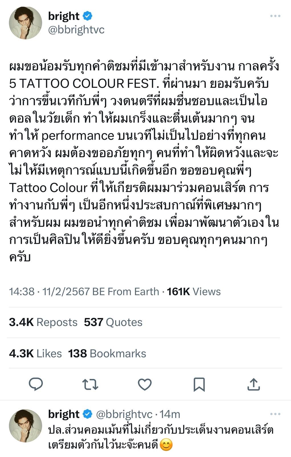 ผมต้องขออภัยทุกๆ คนที่ทำให้ผิดหวังและจะไม่ให้มีเหตุการณ์แบบนี้เกิดขึ้นอีก ขอขอบคุณพี่ๆ Tattoo Colour ที่ให้เกียรติผมมาร่วมคอนเสิร์ต การทำงานกับพี่ๆ เป็นอีกหนึ่งประสบกาณ์ที่พิเศษมากๆสำหรับผม ผมขอนำทุกคำติชม เพื่อมาพัฒนาตัวเองในการเป็นศิลปินให้ดียิ่งขึ้นครับ ขอบคุณทุกๆ คนมากๆ ครับ"