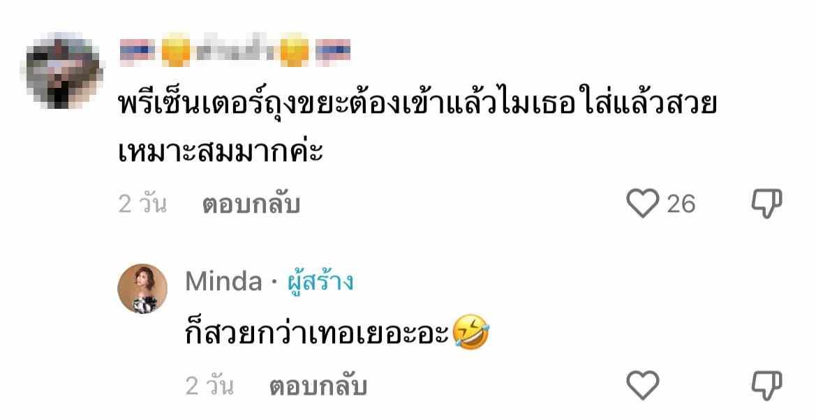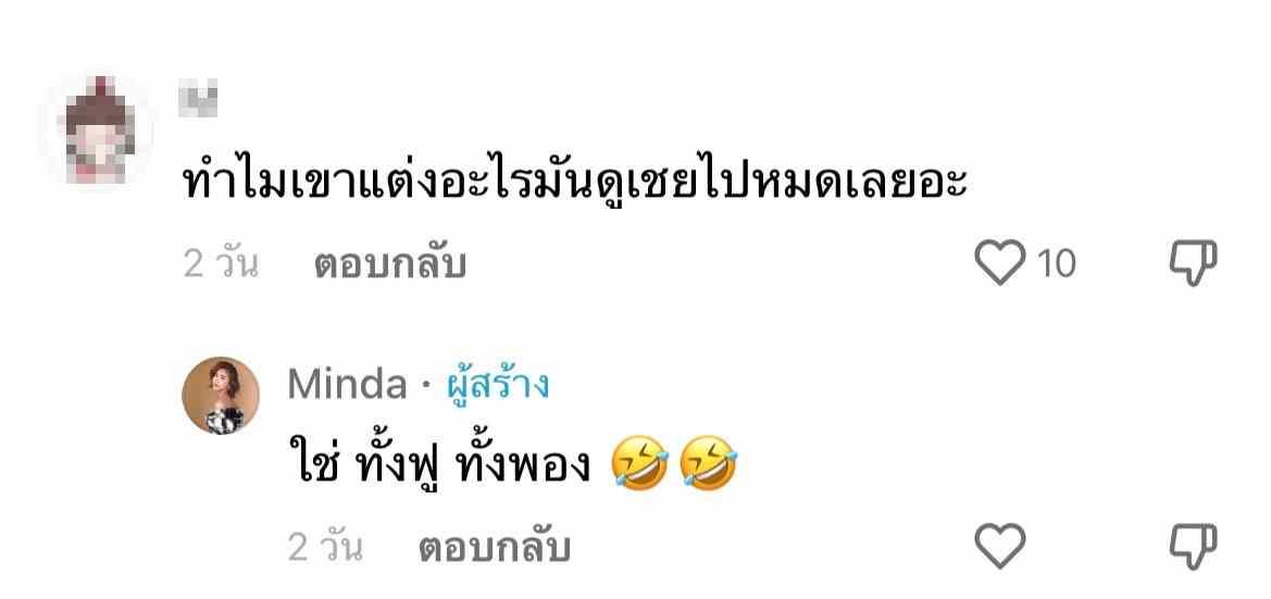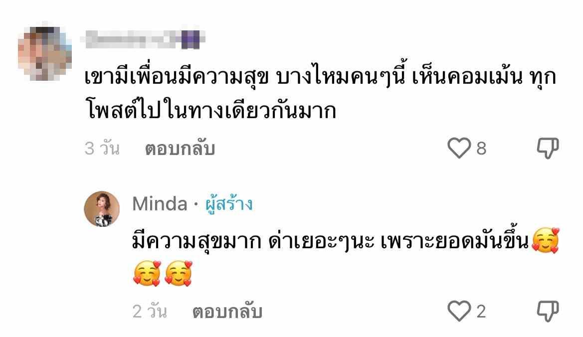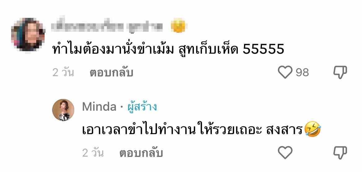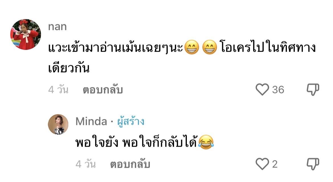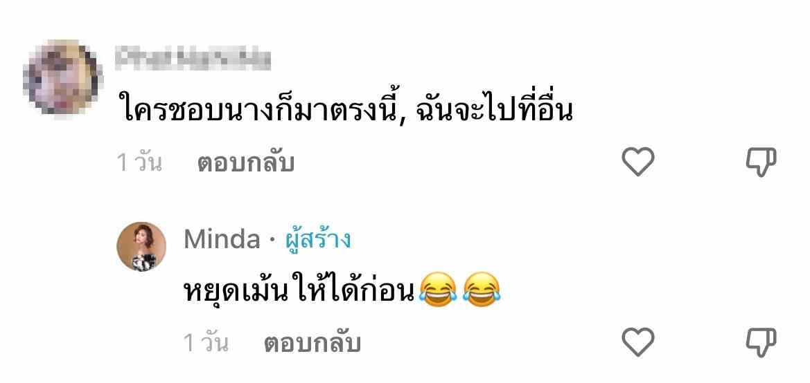 ซึ่งสำหรับคอมเมนต์ที่ชมและให้กำลังใจ เจ้าตัวก็ได้คอมเมนต์ตอบกลับดีๆ แต่ถ้าคอมเมนต์ไหนแซะแรง วิจารณ์แรง มินดาก็ไม่ทน คอมเมนต์สวนกลับชาวเน็ตแบบรายตัวเลยทีเดียว อาทิ