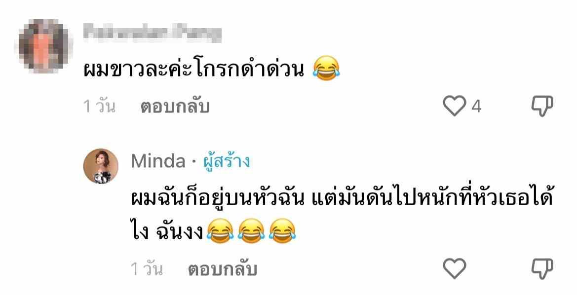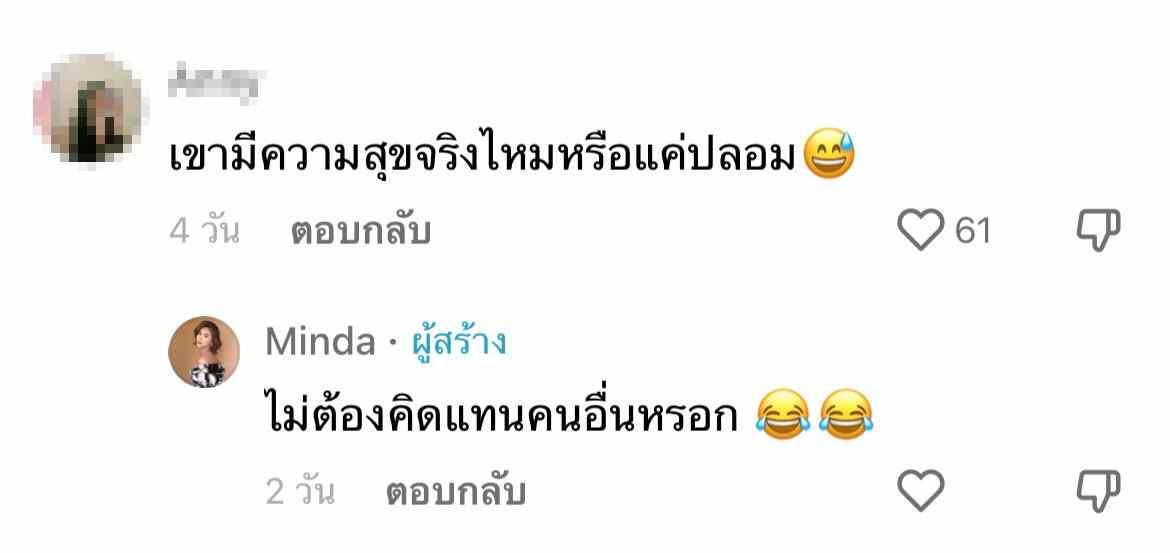และ "เขามีความสุขจริงไหมหรือแค่ปลอม" งานนี้เจ้าตัวตอบว่า "ไม่ต้องคิดแทนคนอื่นหรอก" หรือ "เขามีเพื่อน มีความสุขบ้างไหมคนๆ นี้ เห็นคอมเมนต์ทุกโพสต์ไปในทางเดียวกันมาก" ซึ่งมินดาไม่รอช้า คอมเมนต์ตอบว่า "มีความสุขมาก ด่าเยอะๆ นะ เพราะยอดมันขึ้น" หรือ "ผมขาวละค่ะ โกรกดำด่วน" งานนี้สวนกลับแบบเจ็บๆ ว่า "ผมฉันก็อยู่บนหัวฉัน แต่มันดันไปหนักที่หัวเธอได้ไง ฉันงง"
