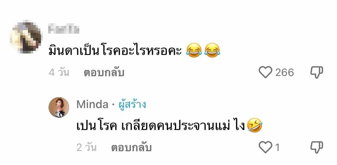 "มินดาเป็นโรคอะไรเหรอคะ" ซึ่งเจ้าตัวก็เมนต์ตอบว่า "เป็นโรคเกลียดคนประจานแม่ไง" หรือ "มองยังไงก็ไม่แพง" เจ้าตัวก็ตอบกลับว่า "เอาเวลาไปขายบ๊วยให้รวยเถอะ เผื่อจะได้ไปเที่ยวกับเขาบ้าง" หรือ "แวะเข้ามาอ่านเมนต์เฉยๆ นะ โอเคร ไปในทิศทางเดียวกัน" มินดาก็ตอบว่า "พอใจยัง พอใจก็กลับได้"