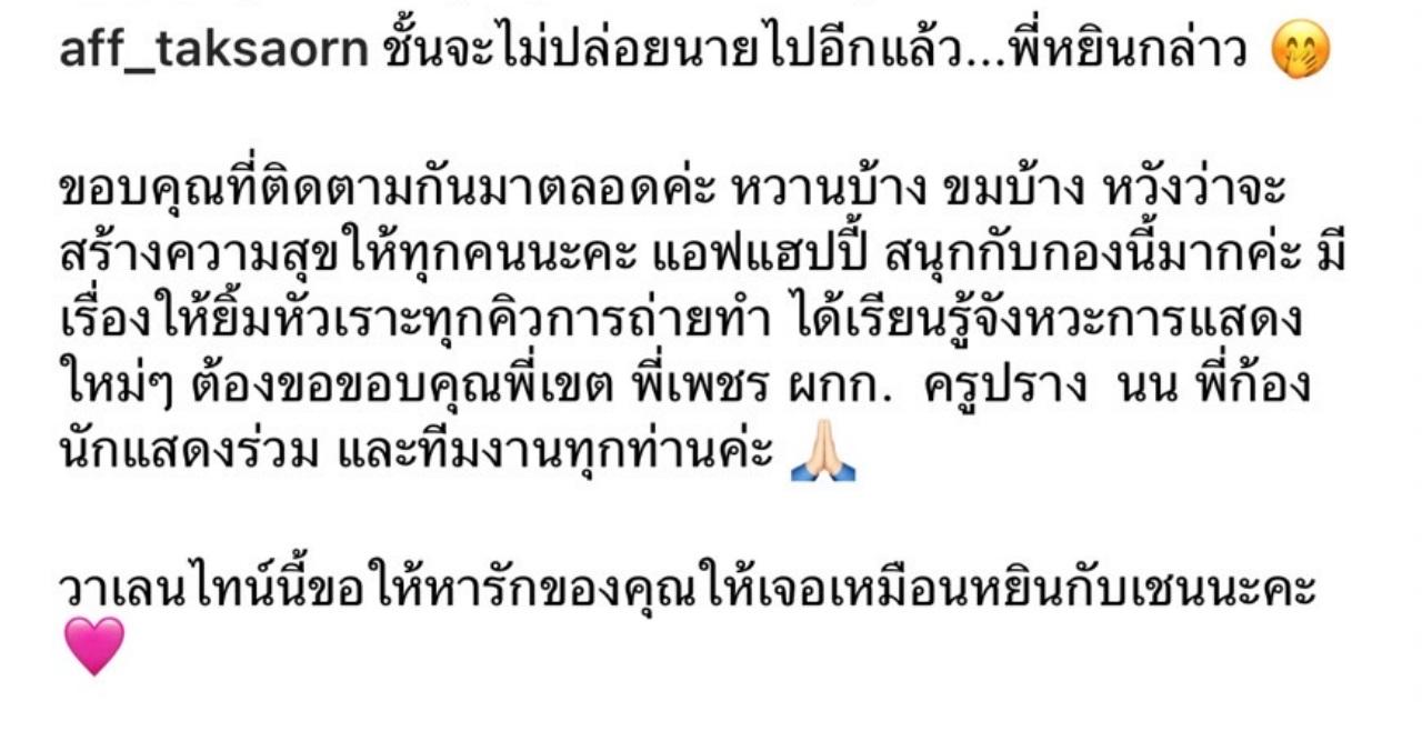 และเขียนแคปชั่นว่า "ชั้นจะไม่ปล่อยนายไปอีกแล้ว...พี่หยินกล่าว ขอบคุณที่ติดตามกันมาตลอดค่ะ หวานบ้าง ขมบ้าง หวังว่าจะสร้างความสุขให้ทุกคนนะคะ แอฟแฮปปี้ สนุกกับกองนี้มากค่ะ มีเรื่องให้ยิ้มหัวเราะทุกคิวการถ่ายทำ ได้เรียนรู้จังหวะการแสดงใหม่ๆ ต้องขอขอบคุณพี่เขต พี่เพชร ผกก. ครูปราง นน พี่ก้อง นักแสดงร่วม และทีมงานทุกท่านค่ะ วาเลนไทน์นี้ขอให้หารักของคุณให้เจอเหมือนหยินกับเชนนะคะ"