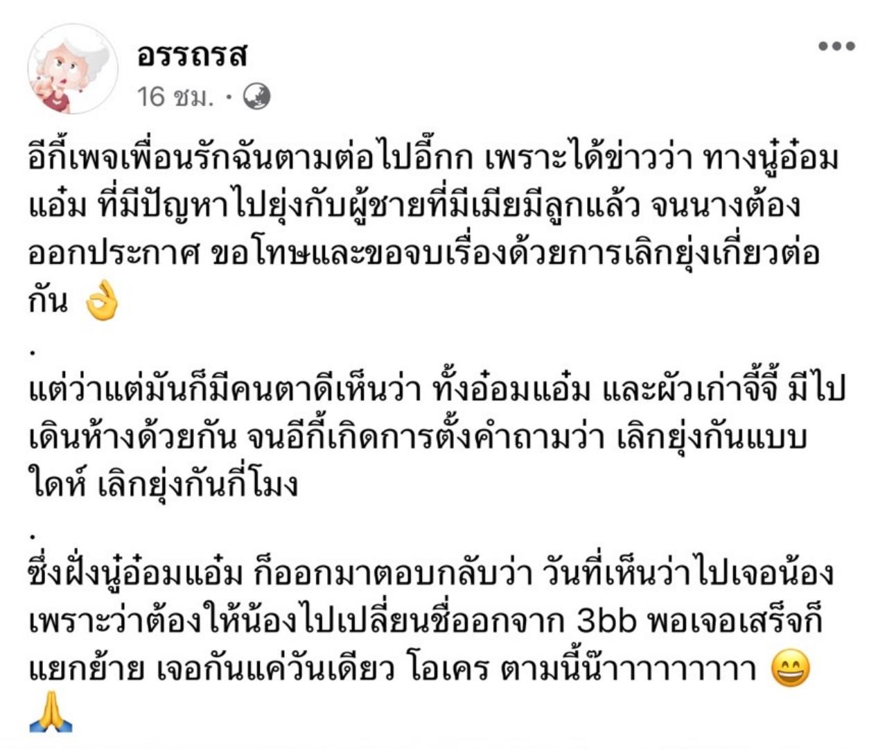 แต่ล่าสุดเพจดังอย่าง อรรถรส ก็ได้ออกมาโพสต์ว่า "อีกี้เพจเพื่อนรักฉันตามต่อไปอี๊กก เพราะได้ข่าวว่า ทางนู๋อ๋อมแอ๋ม ที่มีปัญหาไปยุ่งกับผู้ชายที่มีเมียมีลูกแล้ว จนนางต้องออกประกาศ ขอโทษและขอจบเรื่องด้วยการเลิกยุ่งเกี่ยวต่อกัน
