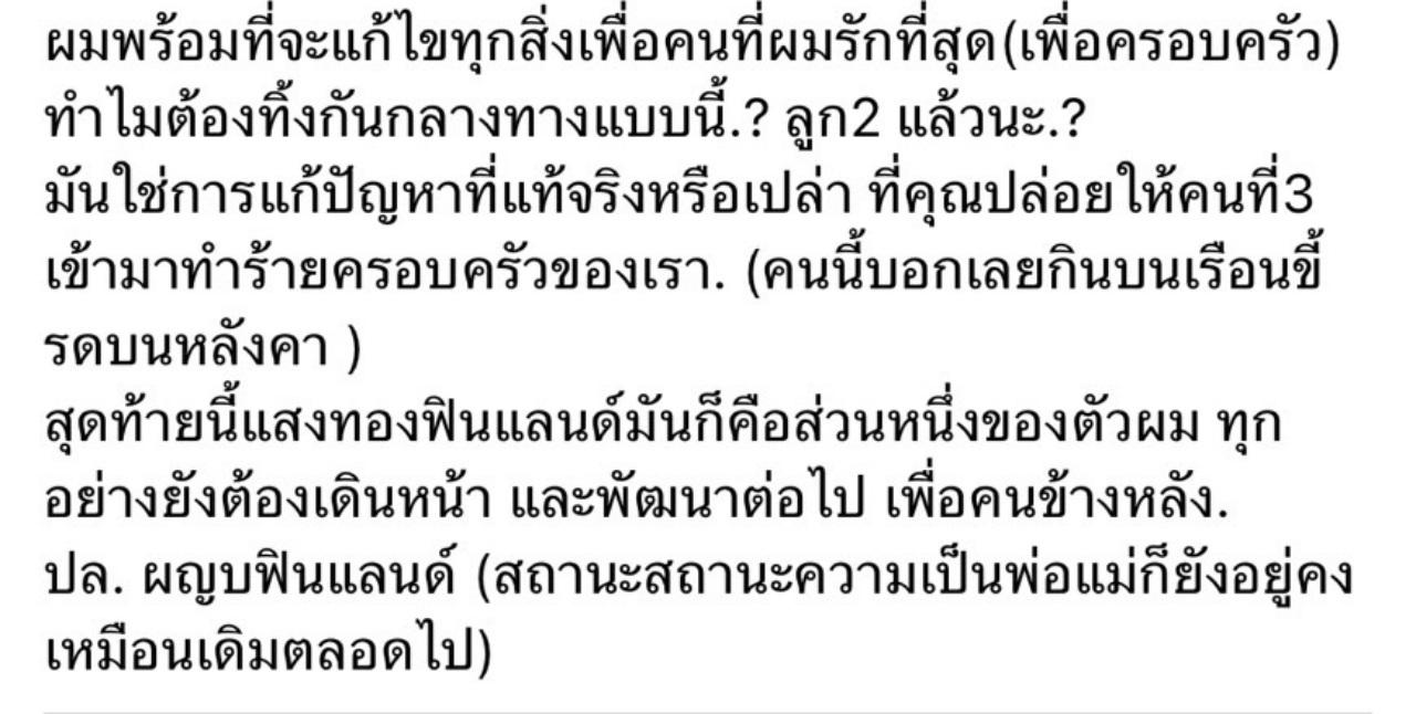 สุดท้ายนี้แสงทองฟินแลนด์มันก็คือส่วนหนึ่งของตัวผม ทุกอย่างยังต้องเดินหน้า และพัฒนาต่อไป เพื่อคนข้างหลัง ปล. ผญบฟินแลนด์ (สถานะความเป็นพ่อแม่ก็ยังอยู่คงเหมือนเดิมตลอดไป)".