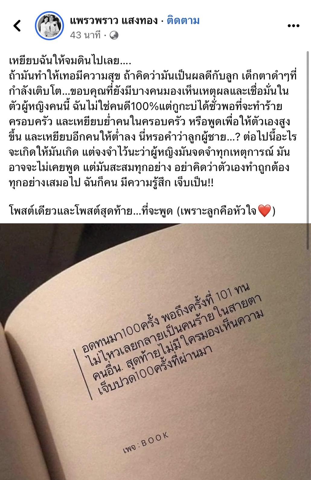 ซึ่ง แพรวพราว ได้โพสต์ข้อความดังกล่าว ระบุว่า "เหยียบฉันให้จมดินไปเลย ถ้ามันทำให้เทอมีความสุข ถ้าคิดว่ามันเป็นผลดีกับลูก เด็กตาดำๆที่กำลังเติบโต ขอบคุณที่ยังมีบางคนมองเห็นเหตุผลและเชื่อมั่นในตัวผู้หญิงคนนี้ ฉันไม่ใช่คนดี100%แต่กูกะบ่ได้ซั่วพอที่จะทำร้าย ครอบครัว และเหยียบย่ำคนในครอบครัว หรือพูดเพื่อให้ตัวเองสูงขึ้น และเหยียบอีกคนให้ต่ำลง นี่หรอคำว่าลูกผู้ชาย…?