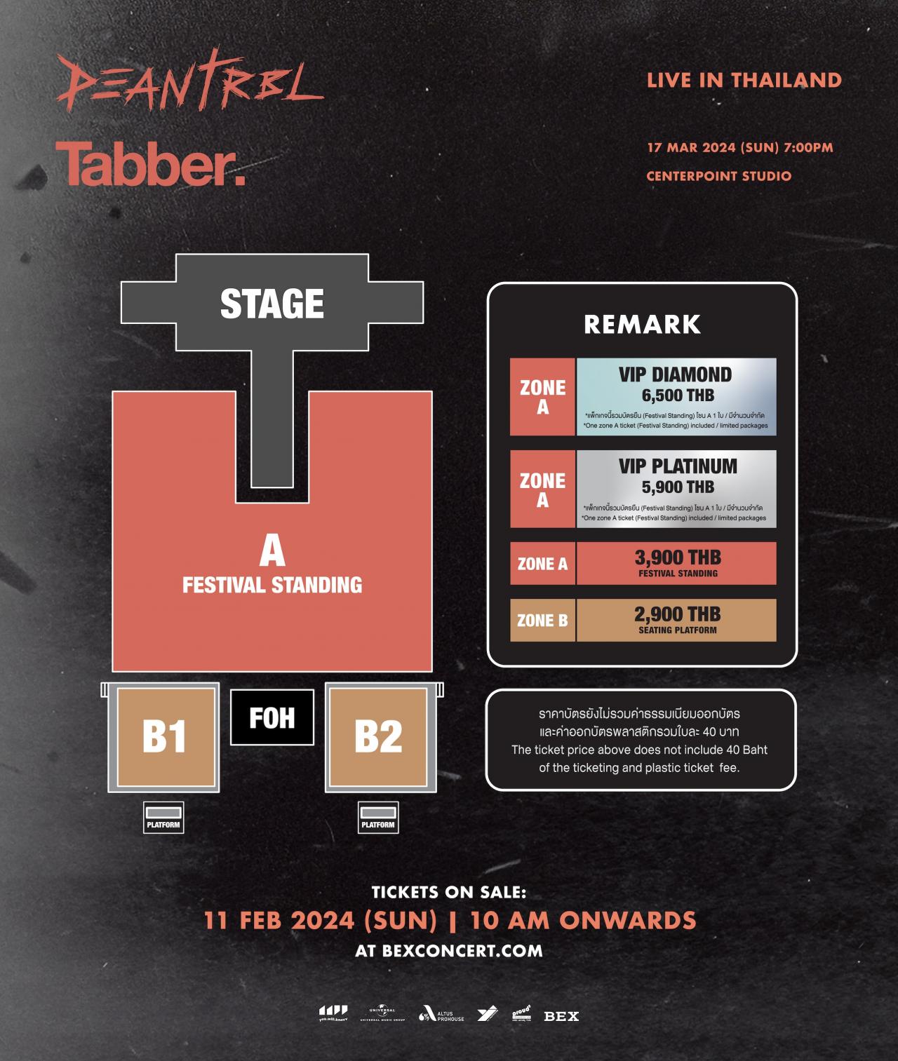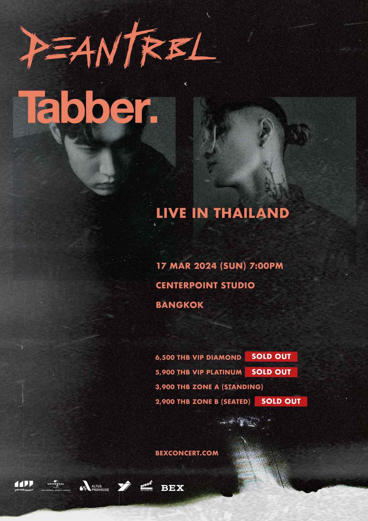 งาน “DEAN with Tabber Live in Thailand” จะถูกจัดขึ้นในวันอาทิตย์ที่ 17 มีนาคม 2567 เวลา 19:00 น. ณ CENTERPOINT STUDIO สุขุมวิท 105 (ซ.ลาซาล) บัตรเหลือจำหน่ายเพียงราคาเดียวเท่านั้นคือ 3,900 บาท ทาง www.bexconcert.com งานนี้จัดเพียง “1 รอบการแสดง” เท่านั้น ห้ามพลาดโดยเด็ดขาด! โดยสามารถติดตามข่าวสารกิจกรรมและข้อมูลต่างๆ เพิ่มเติมได้ที่ Facebook และ X: @BEX_Concert