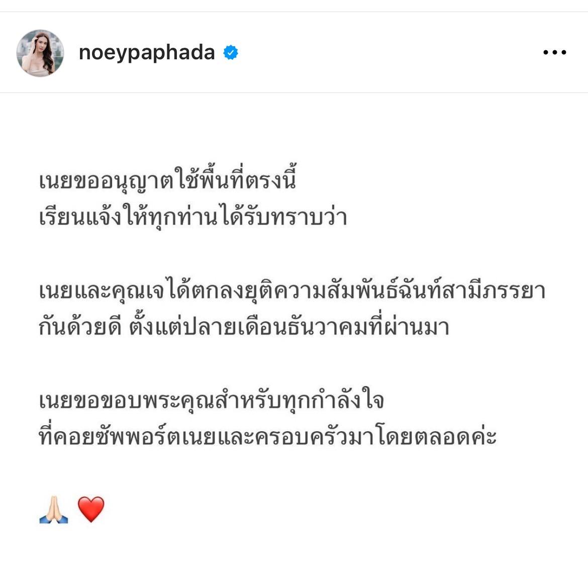 "เนยขออนุญาตใช้พื้นที่ตรงนี้ เรียนแจ้งให้ทุกท่านได้รับทราบว่า เนยและคุณเจได้ตกลงยุติความสัมพันธ์ฉันสามีภรรยากันด้วยดี ตั้งแต่ปลายเดือนธันวาคมที่ผ่านมา เนยขอขอบพระคุณสำหรับทุกกำลังใจ ที่คอยซัพพอร์ตเนยและครอบครัวมาโดยตลอดค่ะ" ซึ่งสาวเนยได้ปิดคอมเมนต์ไม่ให้แสดงความคิดเห็นในโพสต์นี้อีกด้วย