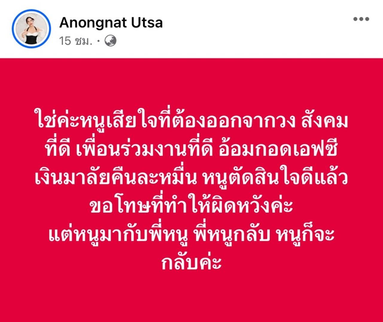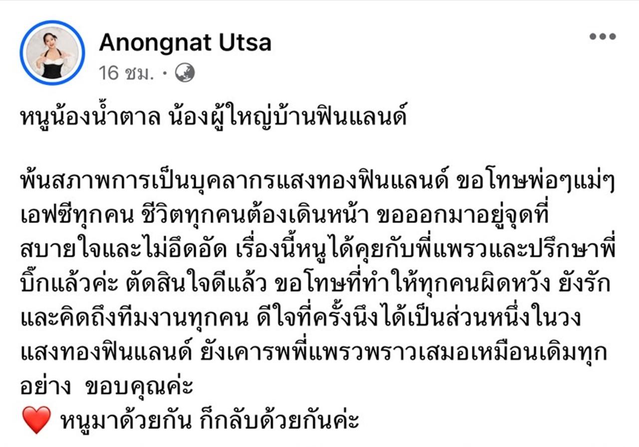 "หนูน้องน้ำตาล น้องผู้ใหญ่บ้านฟินแลนด์ พ้นสภาพการเป็นบุคลากรแสงทองฟินแลนด์ ขอโทษพ่อๆแม่ๆเอฟซีทุกคน ชีวิตทุกคนต้องเดินหน้า ขอออกมาอยู่จุดที่สบายใจและไม่อึดอัด เรื่องนี้หนูได้คุยกับพี่แพรวและปรึกษาพี่บิ๊กแล้วค่ะ ตัดสินใจดีแล้ว