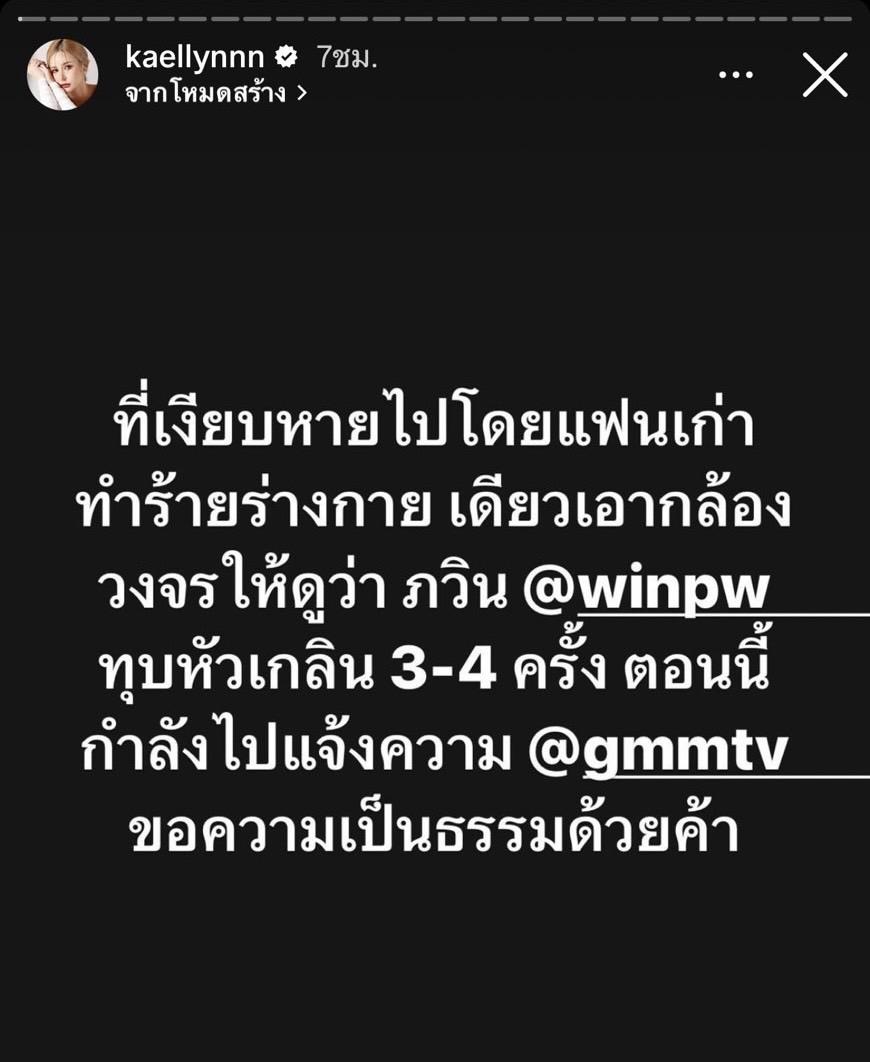 โดยฝ่ายหญิงระบุว่า "ที่เงียบหายไปคือโดนแฟนเก่าทำร้ายร่างกาย เดี๋ยวเอากล้องวงจรมาให้ดูว่า... ทุบหัว 3-4 ครั้ง ตอนนี้กำลังไปแจ้งความ ขอความเป็นธรรมด้วยค่า"