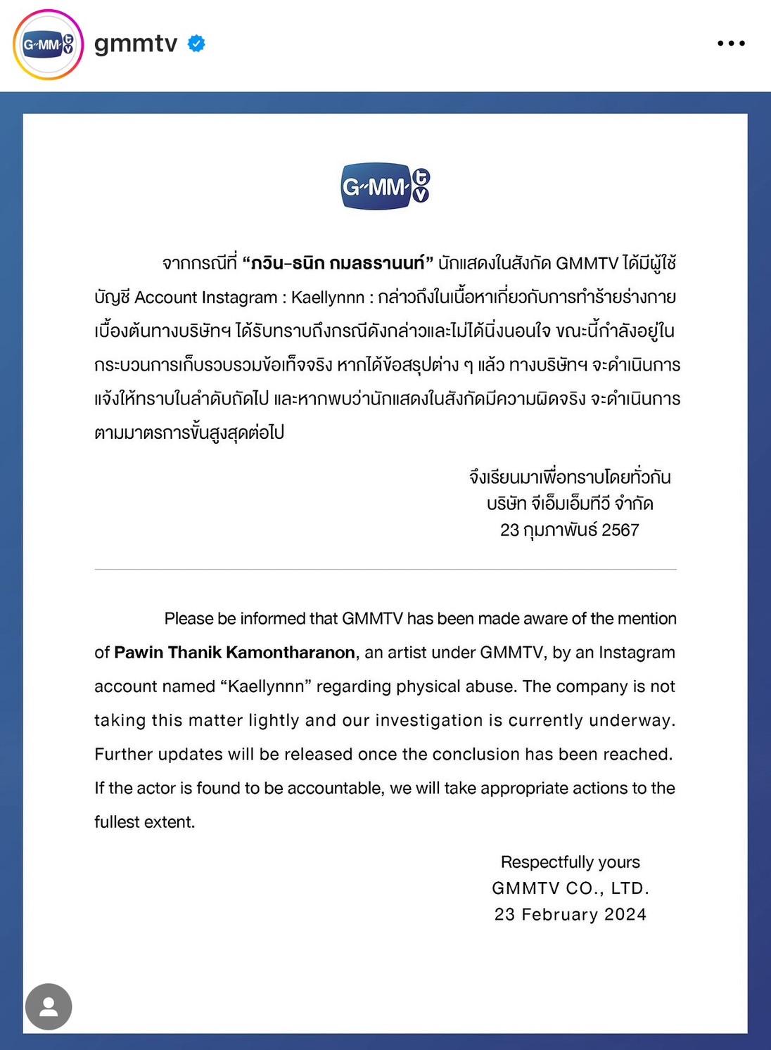 "จากกรณีที่ ภวิน ธนิก กมลธรานนท์ นักแสดงในสังกัด GMMTV ได้มีผู้ใช้บัญชี Account Instagram : Kaellynnn : กล่าวถึงในเนื้อหาเกี่ยวกับการทำร้ายร่างกายเบื้องต้นทางบริษัทฯ ได้รับทราบถึงกรณีดังกล่าวและไม่ได้นิ่งนอนใจ ขณะนี้กำลังอยู่ในกระบวนการเก็บรวบรวมข้อเท็จจริง หากได้ข้อสรุปต่างๆ แล้ว ทางบริษัทฯ จะดำเนินการแจ้งให้ทราบในลำดับถัดไป และหากพบว่านักแสดงในสังกัดมีความผิดจริง จะดำเนินการตามมาตรการขั้นสูงสุดต่อไป จึงเรียนมาเพื่อทราบโดยทั่วกัน"