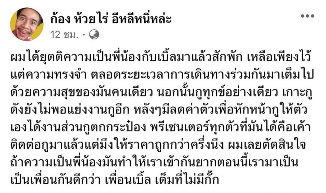 ล่าสุด ก้อง ห้วยไร่ ได้โพสต์ข้อความผ่านเฟซบุ๊กตัวเอง เขียนว่า "ผมได้ยุติความเป็นพี่น้องกับเบิ้ลมาแล้วสักพัก เหลือเพียงไว้แต่ความทรงจำ ตลอดระยะเวลาการเดินทางร่วมกันมาเต็มไปด้วยความสุขของมันคนเดียว นอกนั้นกูทุกข์อย่างเดียว
