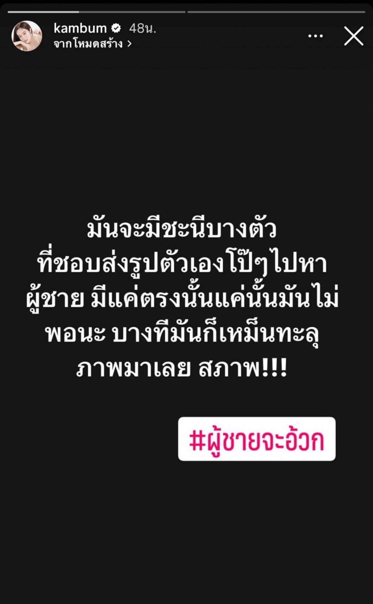 และล่าสุดก็ฟาดสับๆ ไปเลย เมื่อ แก้มบุ๋ม ได้ออกมาโพสต์ข้อความผ่านไอจีสตอรี่ ถึงผู้หญิงบางคนที่ชอบส่งรูปโป๊หาผู้ชาย พร้อมใส่แฮชแท็กสุดแซ่บปิดท้าย บอกว่า