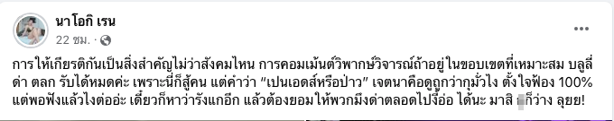 "การให้เกียรติกันเป็นสิ่งสำคัญไม่ว่าสังคมไหน การคอมเมนต์วิพากษ์วิจารณ์ถ้าอยู่ในขอบเขตที่เหมาะสม บูลลี่ ด่า ตลก รับได้หมดค่ะ เพราะนี่ก็สู้คน แต่คำว่า “เปนเอดส์หรือป่าว” เจตนาคือดูถูกว่ากุมั่วไง ตั้งใจฟ้อง 100% แต่พอฟังแล้วไงต่ออ่ะ เดี๋ยวก็หาว่ารังแกอีก แล้วต้องยอมให้พวกมึงด่าตลอดไปงี้อ่อ ได้นะ มาสิ กุก็ว่าง ลุยย!"