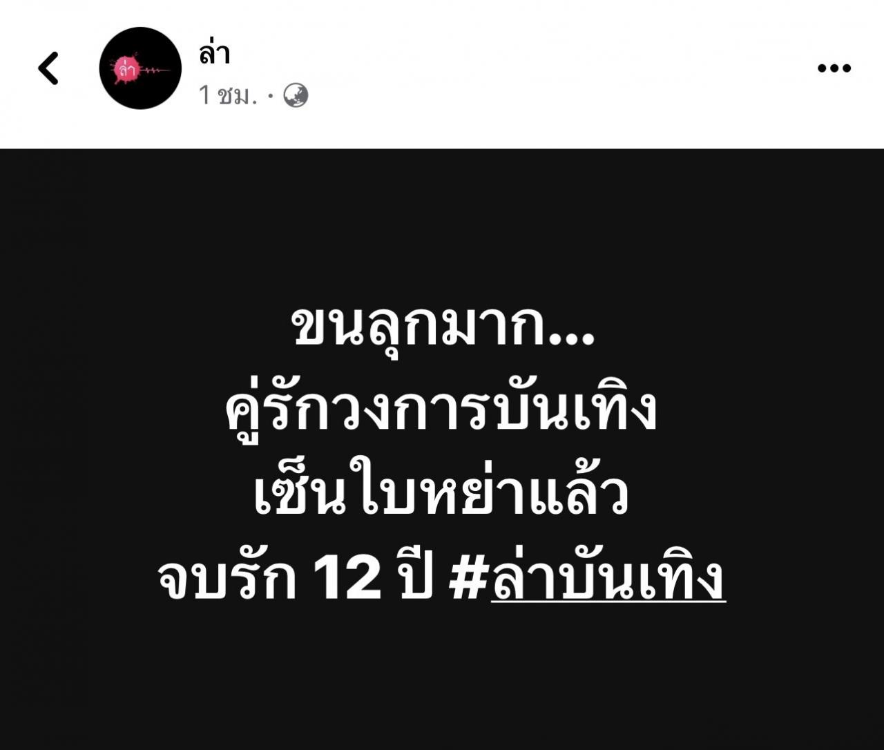 เริ่มต้นเดือนมีนาได้ร้อนฉ่ากันสุดๆ สำหรับวงการบันเทิงบ้านเรา ล่าสุดวันนี้ (1 มีนาคม 2567) แฟนเพจเฟซบุ๊ก ล่า ได้ออกมาโพสต์ข้อความปริศนาว่า "ขนลุกมาก...คู่รักวงการบันเทิงเซ็นใบหย่าแล้ว จบรัก 12 ปี"