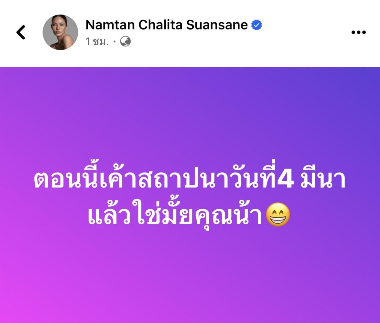 ล่าสุด น้ำตาล ชลิตา ส่วนเสน่ห์ นางงาม-นักแสดงชื่อดัง เคลื่อนไหวผ่านทางเฟซบุ๊กส่วนตัว เกี่ยวกับเหตุการณ์ดังกล่าวที่เกิดขึ้น โดยระบุข้อความว่า "ตอนนี้เค้าสถาปนาวันที่ 4 มีนาแล้วใช่มั้ยคุณน้า" ท่ามกลางแฟนคลับและแฟนนางงามเข้ามาคอมเมนต์กันเป็นจำนวนมาก.