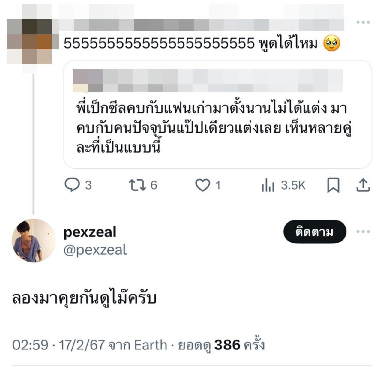 หลังจากที่ก่อนหน้านี้ได้มีคนออกโพสต์ข้อความถึง เป๊กซ์ ปราชญ์ พงษ์ไชย หรือ เป๊กซ์ วง Zeal ทางทวิตเตอร์ (X) ในประเด็นเรื่องแฟนเก่าที่คบกันมาตั้งนาน แต่กลับไม่ได้แต่งงาน แต่พอมาคบกับคนปัจจุบันแค่แป๊บเดียวก็แต่งเลย จากประเด็นดังกล่าวก็ทำให้ เป๊กซ์ ได้ถูกวิพากษ์วิจารณ์อย่างหนัก